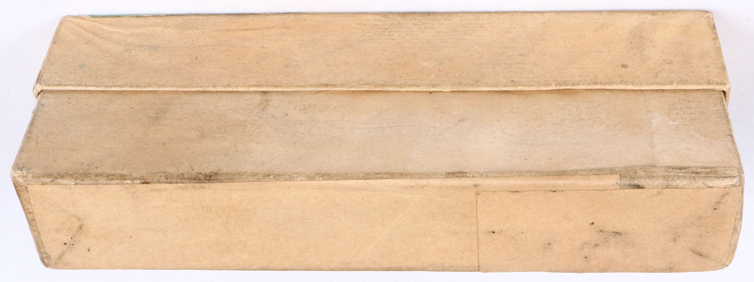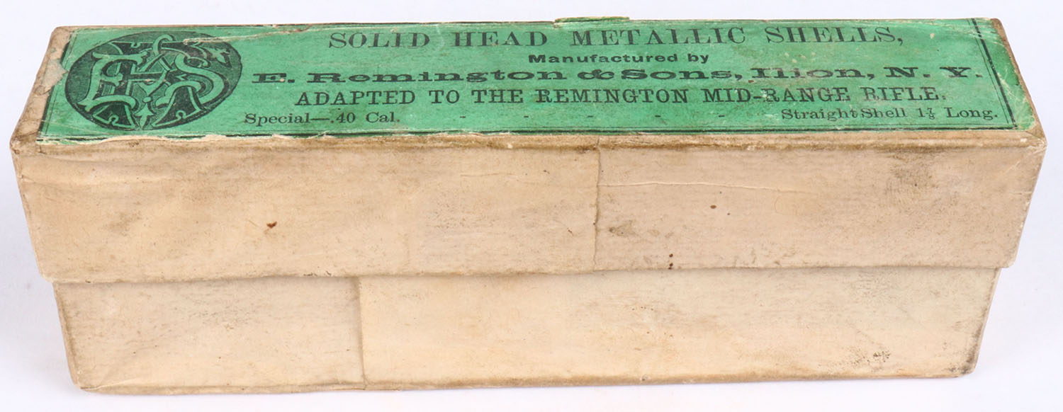 E. Remington & Sons, .40 Cal. Straight shell 1 7/8'' long, primed metallic shells, 2pc, partial 19 Rds. One has dented primer, buff box with green label & black print, box is solid with one glue repaired seam on lid, light rub marks & light edge wear, shells are very good. Grade: Very Good ++ - Value: 50 to 300