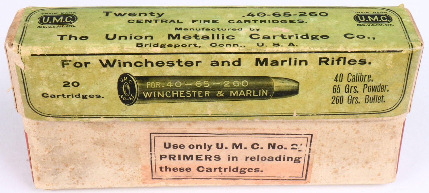 UMC, .40-65-260 Winchester & Marlin, 260 Gr. Bullet, 2pc, FULL & SEALED, buff box with green label & black print, box is solid with light age spotting, light rub marks, & light edge wear. Grade: Excellent - Value: 30 to 60