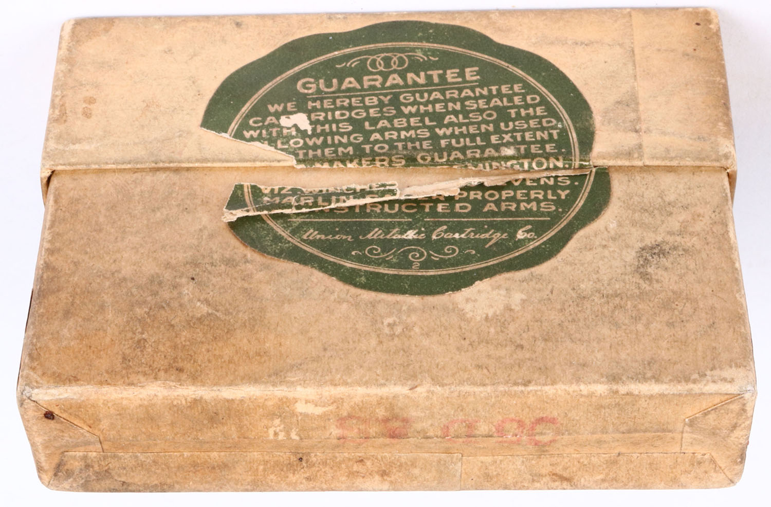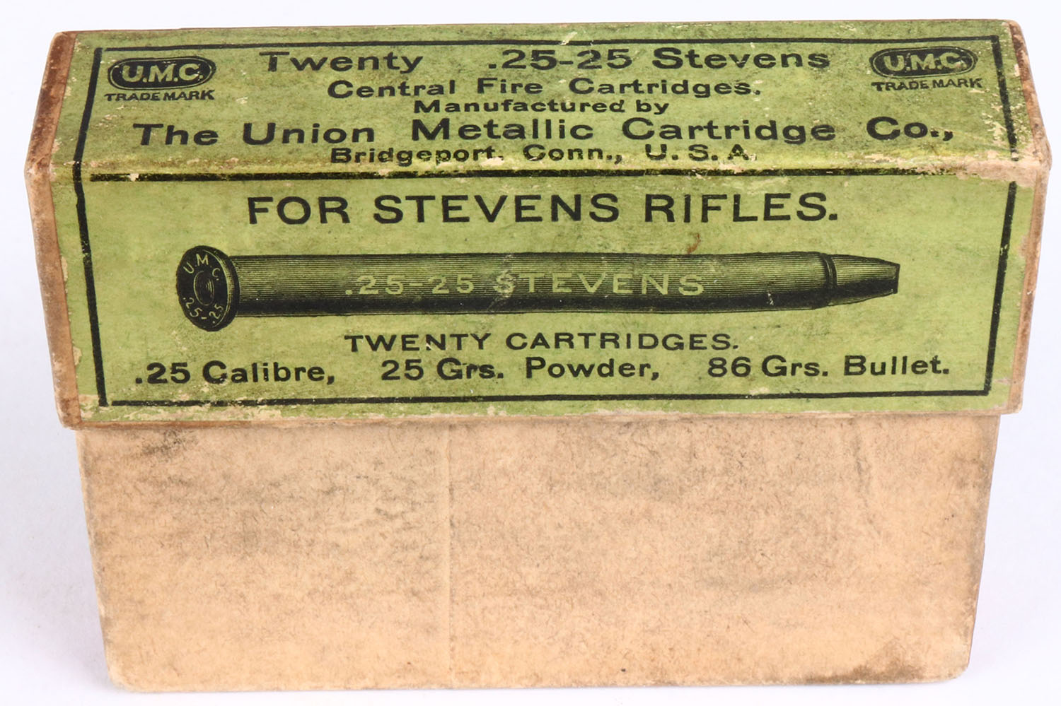 UMC, .25-25 Stevens, 86 Gr. Inside lubricated Bullet, 2pc, Full, buff box with green label & black print, box is solid with light age spotting, light rub marks, & light edge wear. Grade: Excellent - Value: 80 to 160