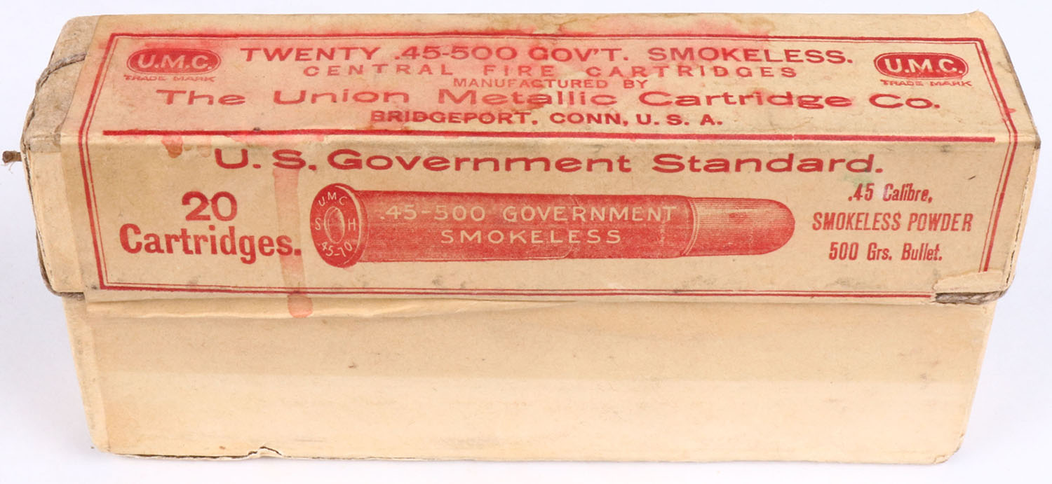 UMC, .45-500 Government, Smokeless, 500 Gr. Bullet, 2pc, FULL & SEALED, buff box & label with red print, box has one seam split & one partial seam split on bottom box, water stain on top label, & light wear. Grade: Excellent - Value: 30 to 90