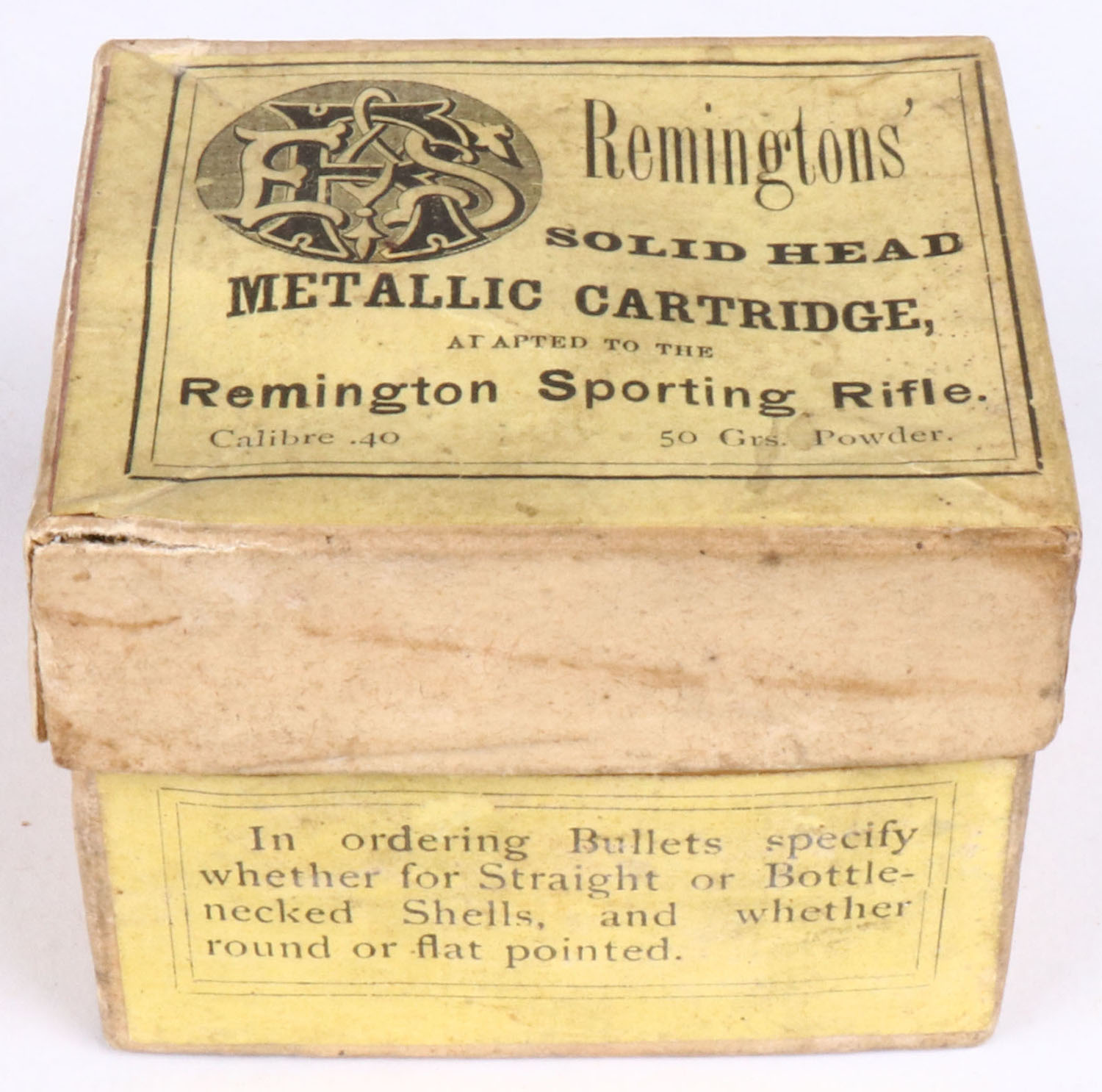 E. Remington & Sons, .40-50 Solid Head, 2pc, Partial 16 Rds., buff box with yellow label & black print, box has two split corner seams, light age soiling, light rub marks & light edge wear, ammo is good. Grade: Very Good ++ - Value: 50 to 200