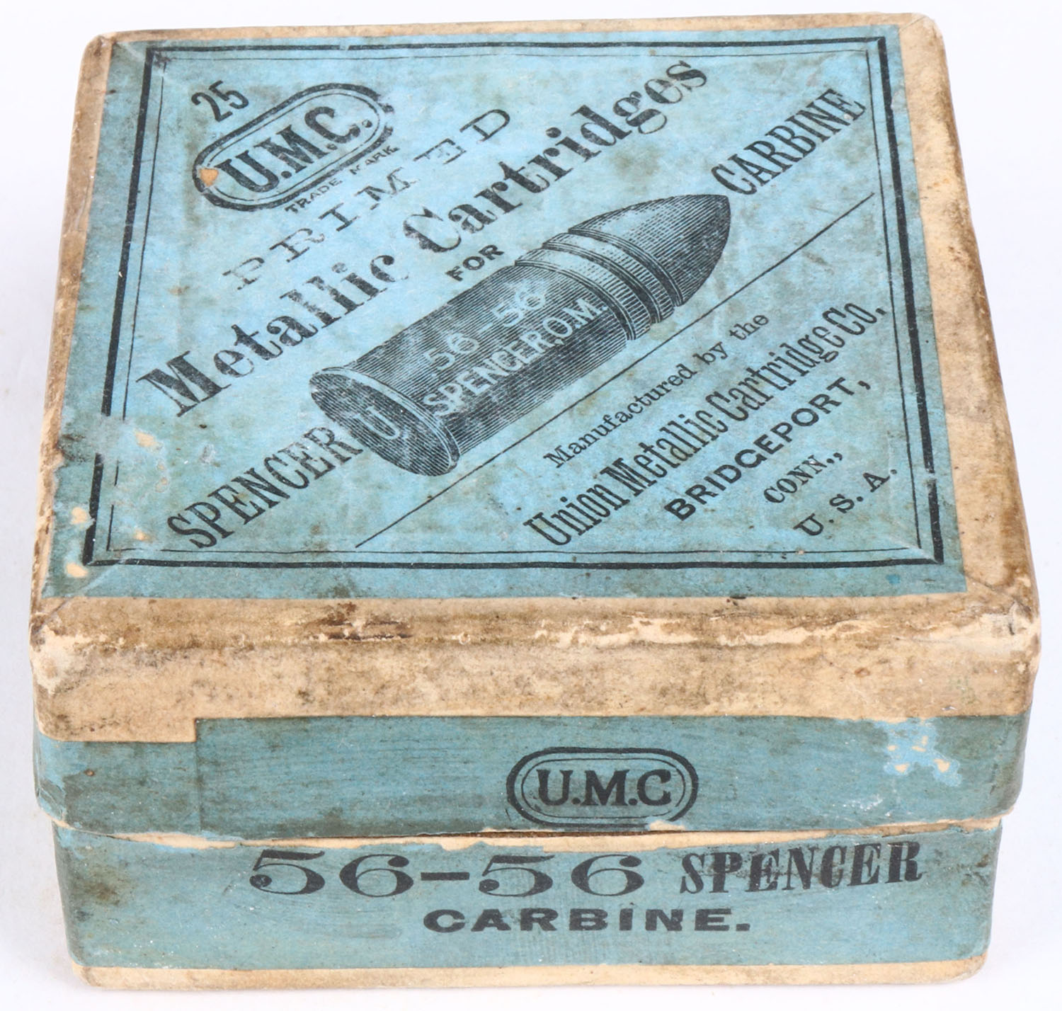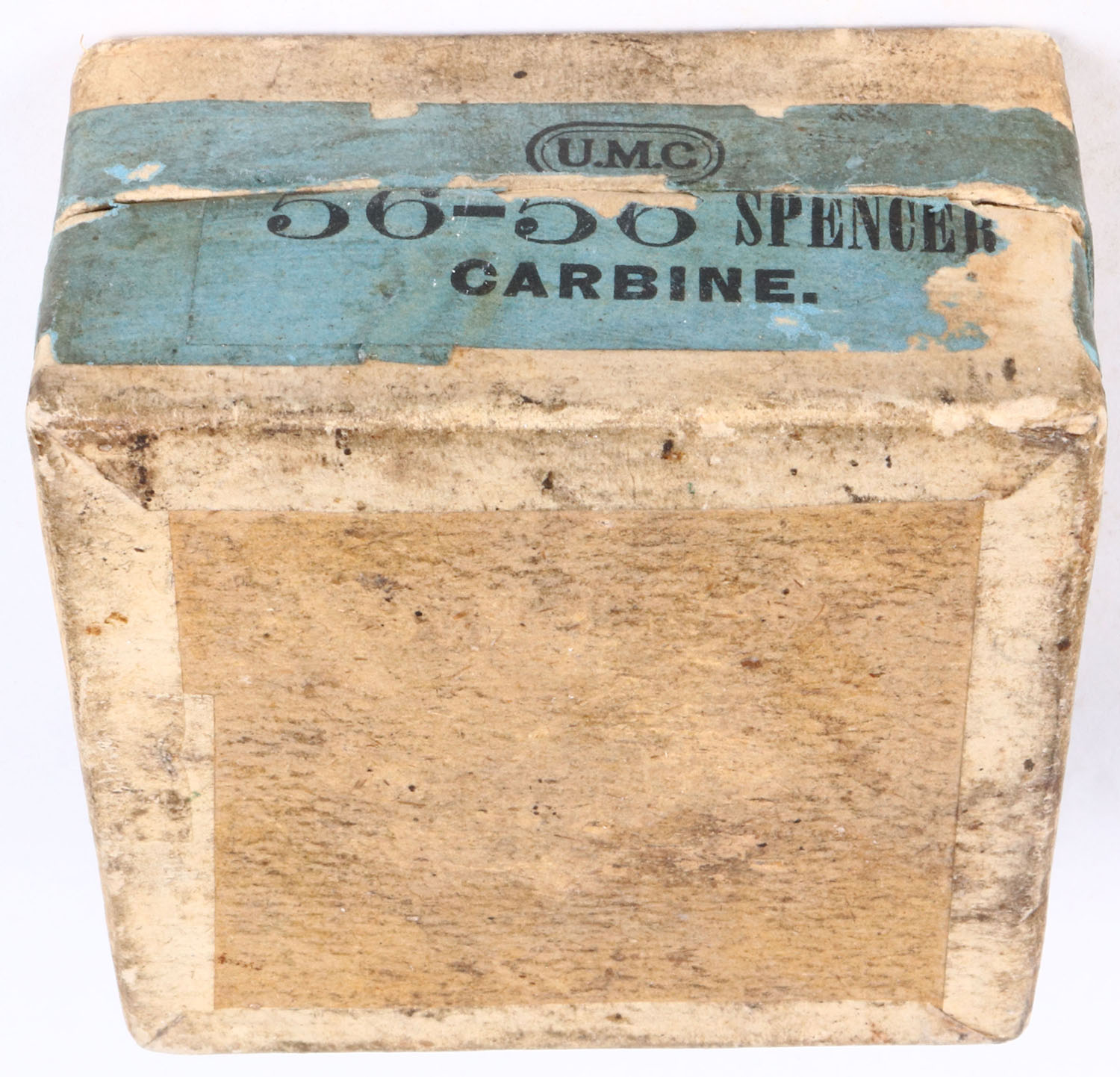 UMC, .56-56 Spencer Carbine, 2pc, Full, buff box with blue label & black print, box is solid with minor age soiling, light rub marks & light edge wear, ammo is good to fair. Grade: Very Good ++ - Value: 100 to 500