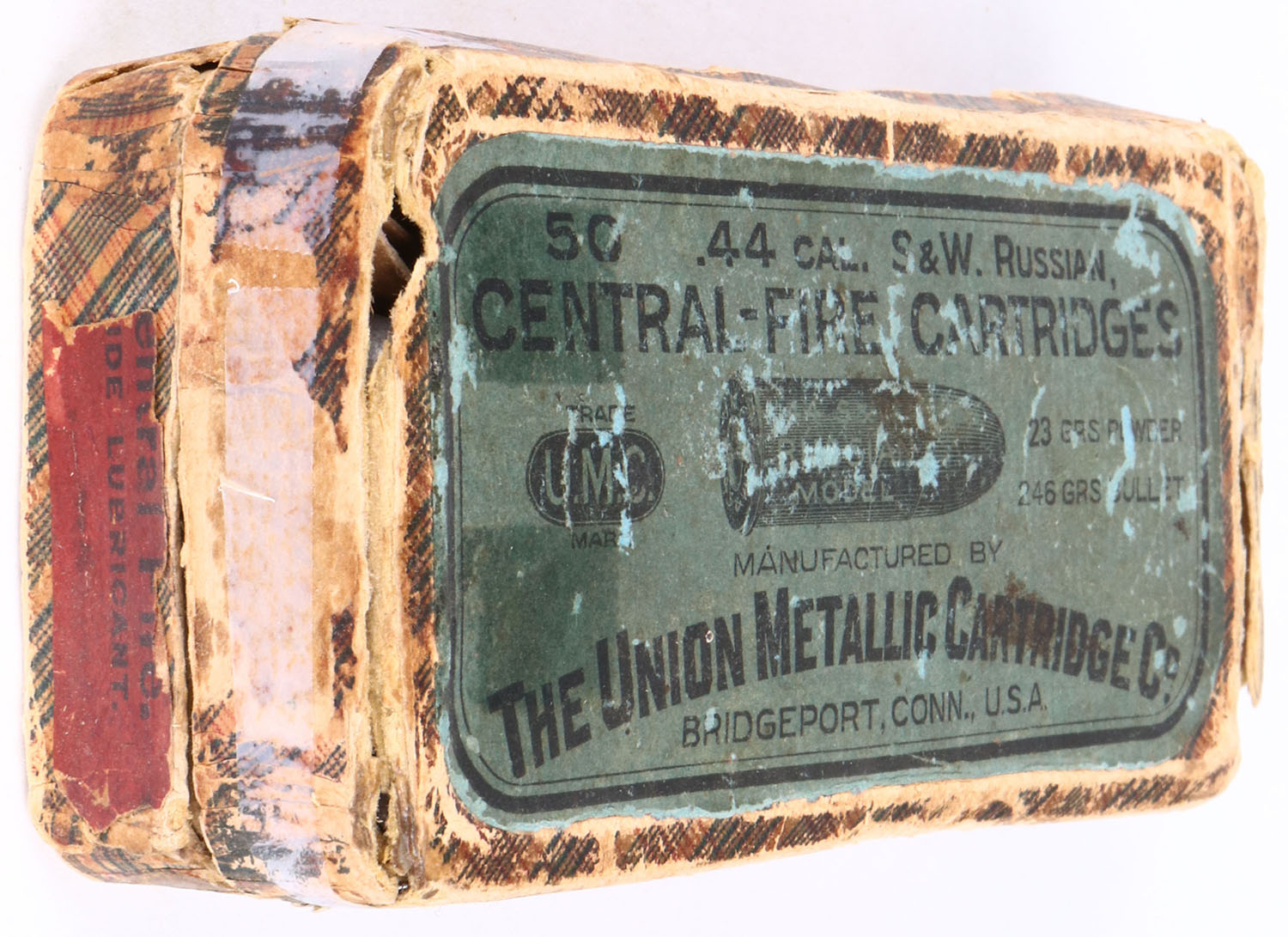 UMC, .44 S&W Russian, 23 Grs Powder, 246 Grs. Bullet, 2pc, partial 48 Rds. With all Rem-UMC H/S, fabric box with blue/red label & black print, box is weak with multiple seam splits & tears in box, sticker marks, rub marks, light edge wear, ammo is very good. Grade: Good + - Value: 40 to 300