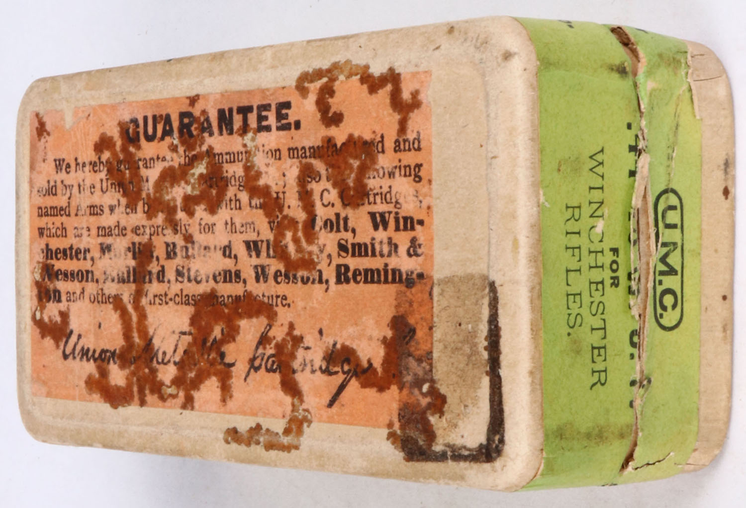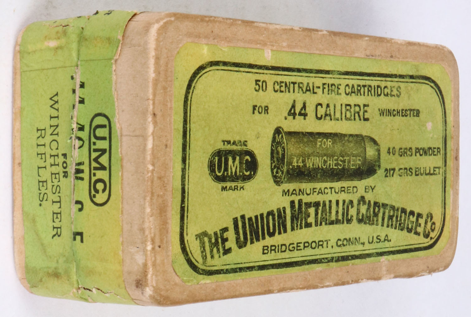 UMC, .44 Calibre Winchester, 40 Grs. Powder, 217 Grs. Bullet, 2pc, Full, buff box with green label & black print, box is solid with light rub marks, sticker mark on bottom & age staining on bottom, ammo is Fair. Grade: Excellent - Value: 150 to 350