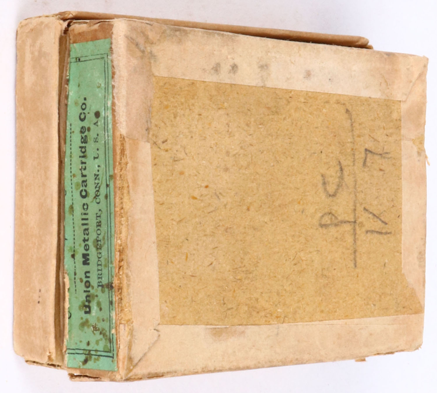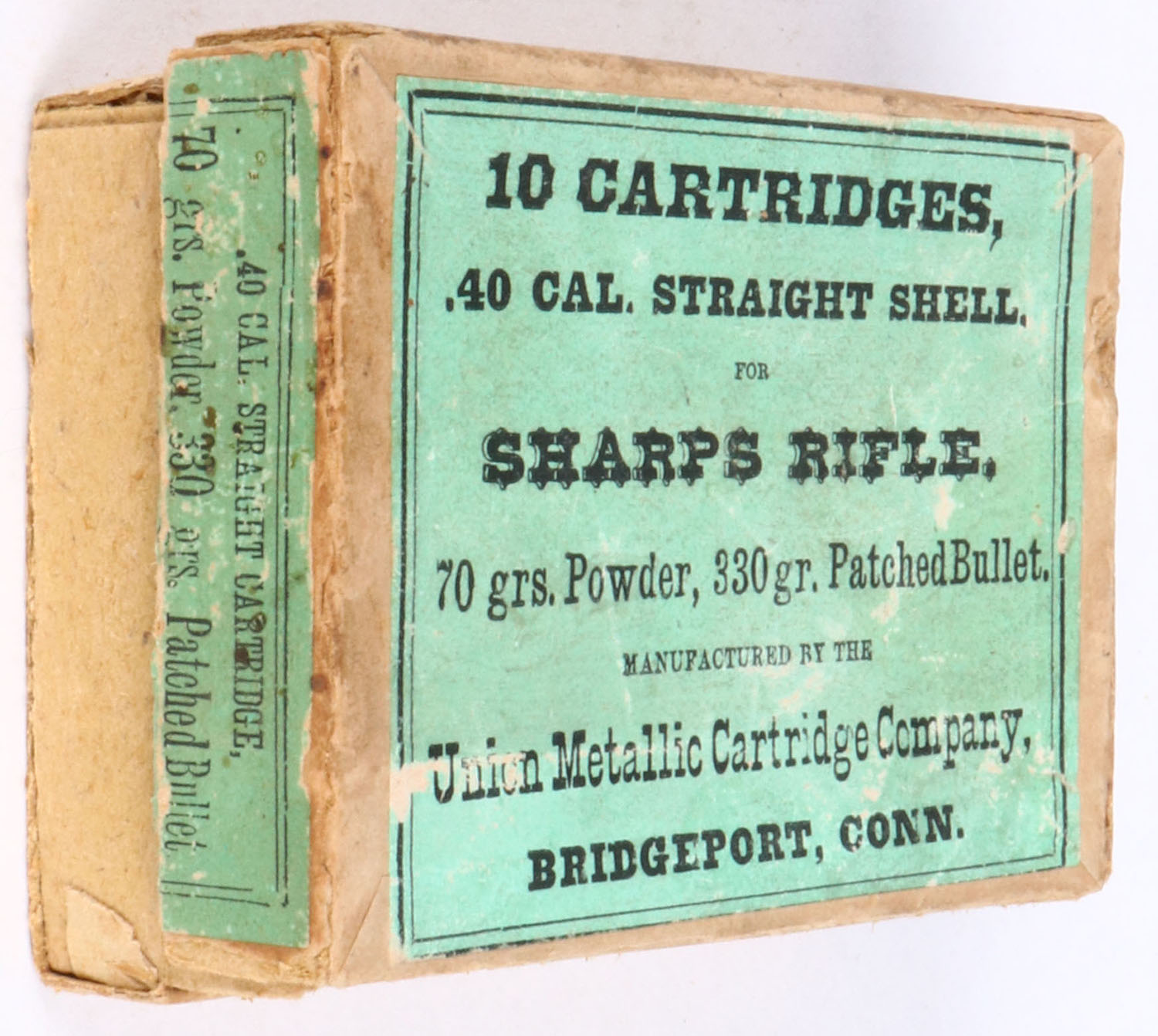 UMC, .40-70 Cal Straight shell for Sharps Rifle, 330 Gr. Patched Bullet, 1pc, Full. Buff box with green label & black print, box is missing from side of lid, multiple seam splits, glued seams, tub marks , & edge wear, ammo is very good. Grade: Good + - Value: 30 to 300