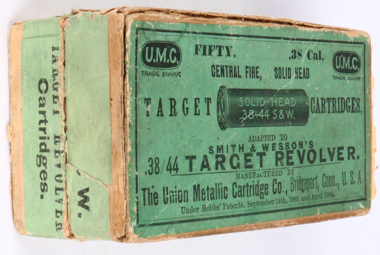 RARE!! UMC, .38-44 S&W, Bullet, 2pc, Full but some rounds are primed with no bullet & powder, buff box with green label & black print, box is missing right end on bottom box, partial seam split on lid, rub marks & edge wear, ammo is very good. Grade: Excellent - Value: 100 to 1000