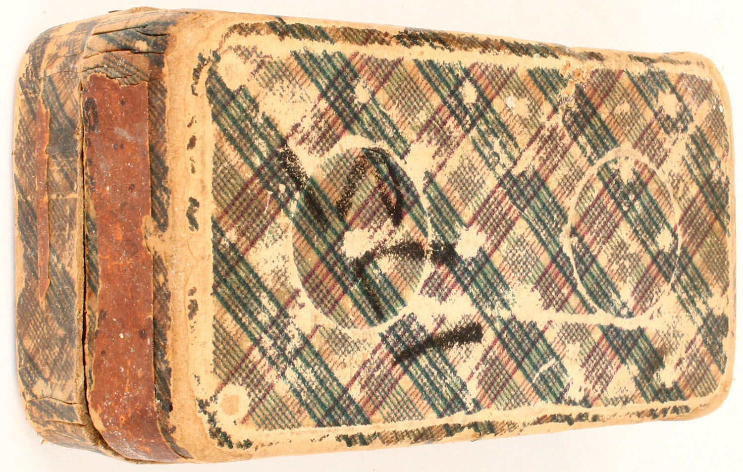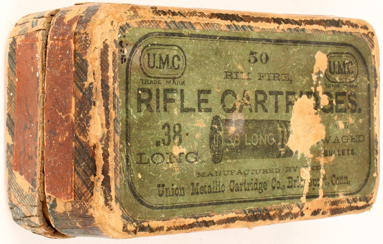 UMC, .38 Long, Swaged Bullet, 2pc, partial Approx. 40 Rds. Of correct ammo, fabric box with green label & black print, box is solid with heavy handling wear, tears in top label, age soiling, rub marks, & edge wear, ammo is good to fair. Grade: Very Good - Value: 10 to 60
