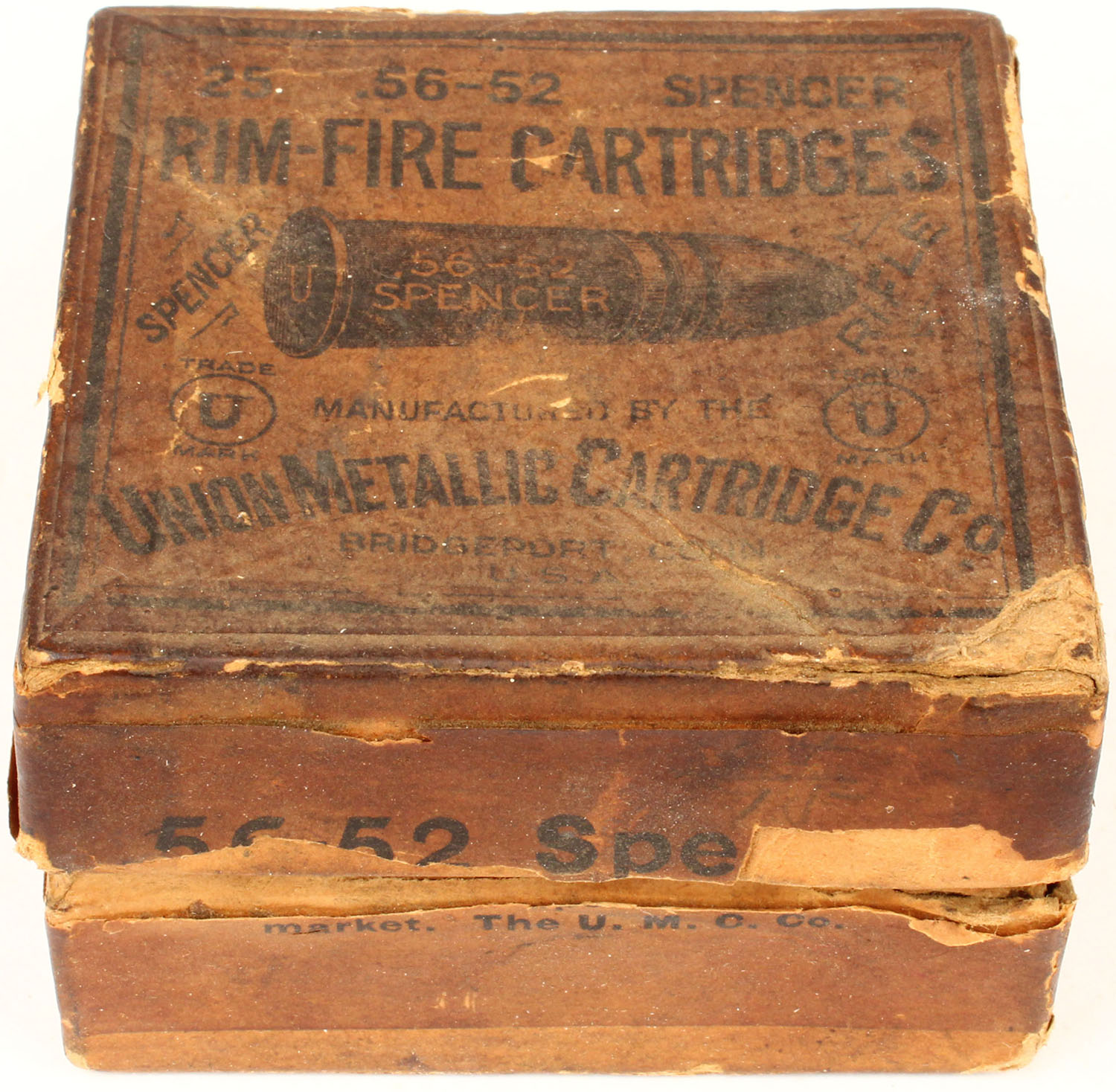 UMC, .56-52 Spencer, 2pc, Full, buff box & label with black print, box has one split corner seam & one partial split seam on lid, age soiling, color fading, small parts of label missing, rub marks, & edge wear, ammo is very good. Grade: Very Good + - Value: 100 to 300