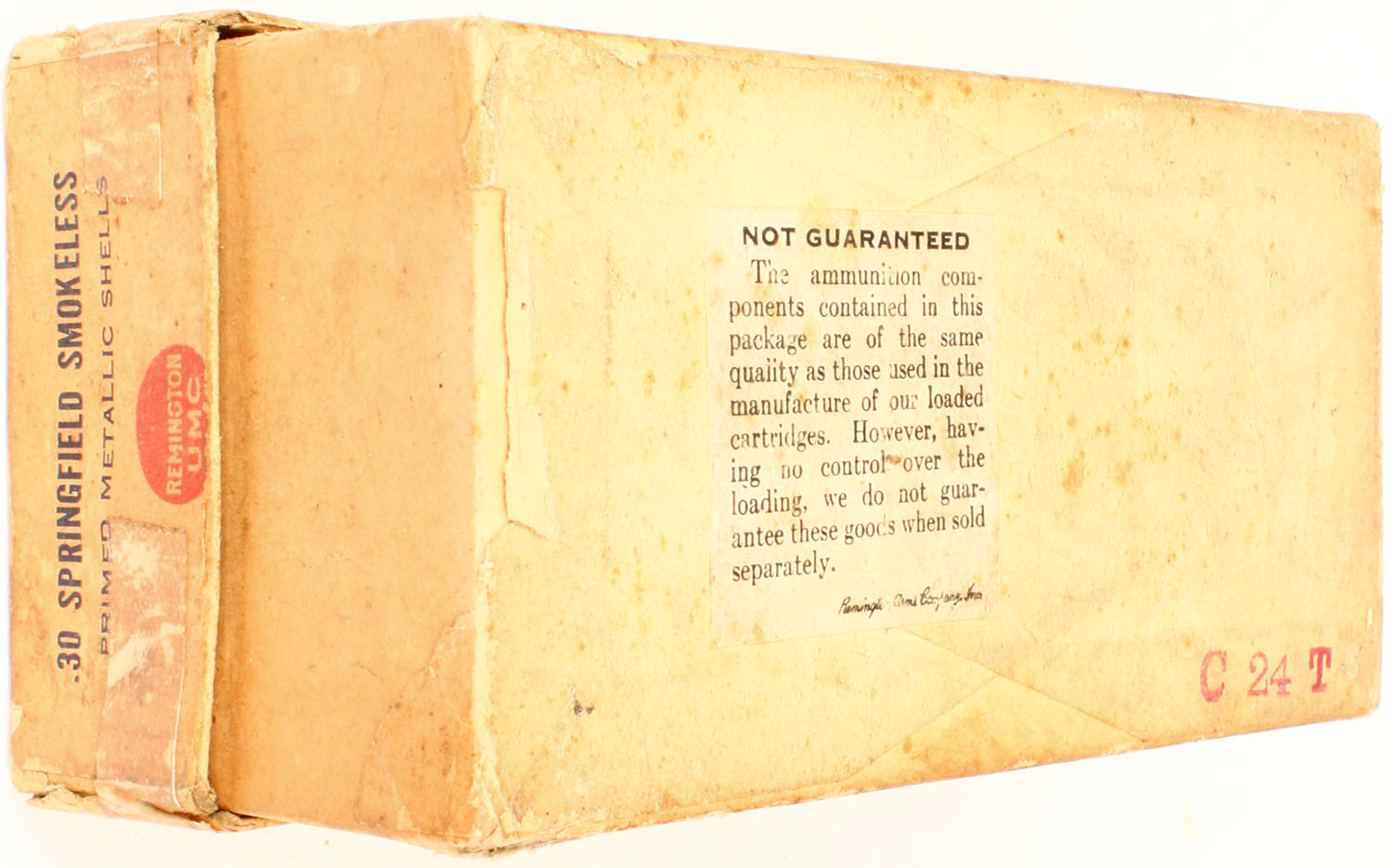 REM-UMC, .30 Springfield Model 1906 (30-06), Primed Metallic shells, smokeless, 2pc, Partial 24 shells, buff box & label with black/red print, box has two taped seam repairs on lid, age soiling, light rub marks & edge wear, shells are excellent. Grade: Very Good + - Value: 10 to 100