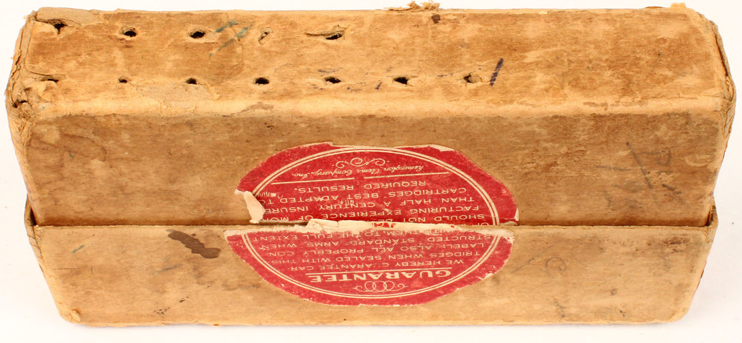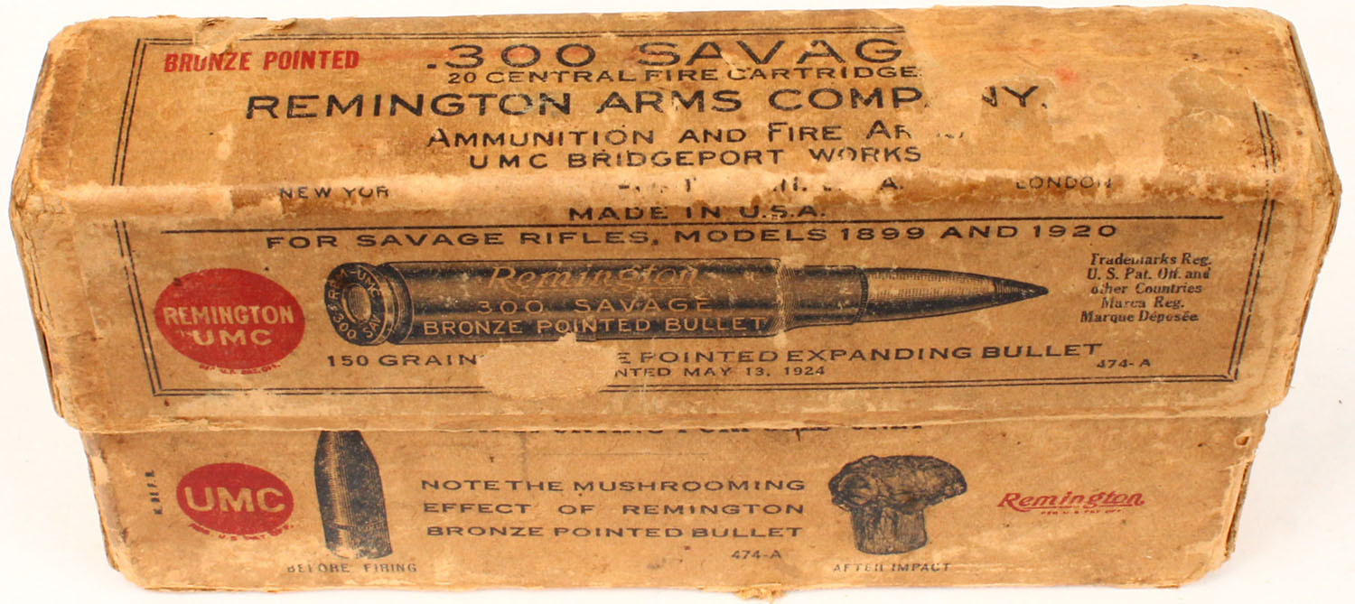 REM-UMC, .300 Savage, smokeless, 150 Gr. Bronze pointed bullet, 2pc, Partial 12 Rds., buff box & label with black/red print, box is solid with holes in bottom from bullets, tears in label, light age soiling, rub marks, & edge wear, ammo is very good. Grade: Very Good + - Value: 20 to 100