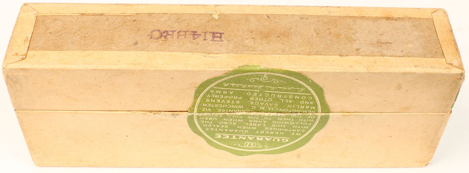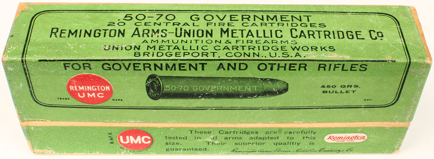 REM-UMC, .50-70 Government, black powder, 450 Gr. bullet, 2pc, Full, buff box with green label & black/red print, box is solid with minor rub marks, & minor edge wear, ammo is excellent. Grade: Excellent ++ - Value: 50 to 150