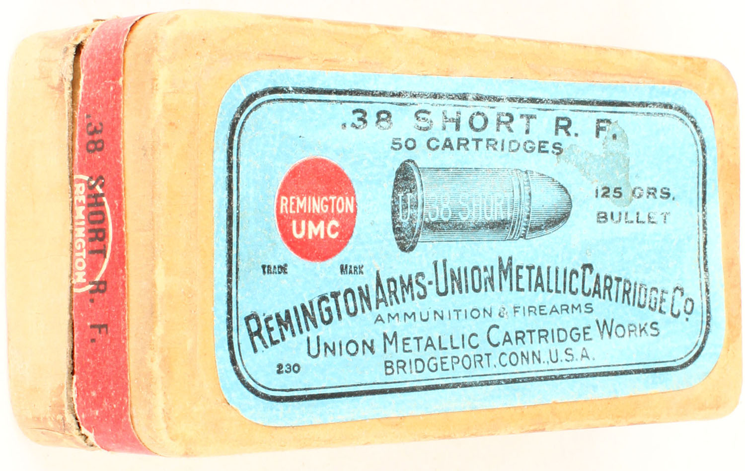REM-UMC, .38 Short R.F., black powder, 125 Gr. bullet, 2pc, Full, buff box with blue/red label & black print, box is solid with tape on box, rub marks, parts of side labels missing, light stain, & edge wear, ammo is very good. Grade: Very Good + - Value: 30 to 90