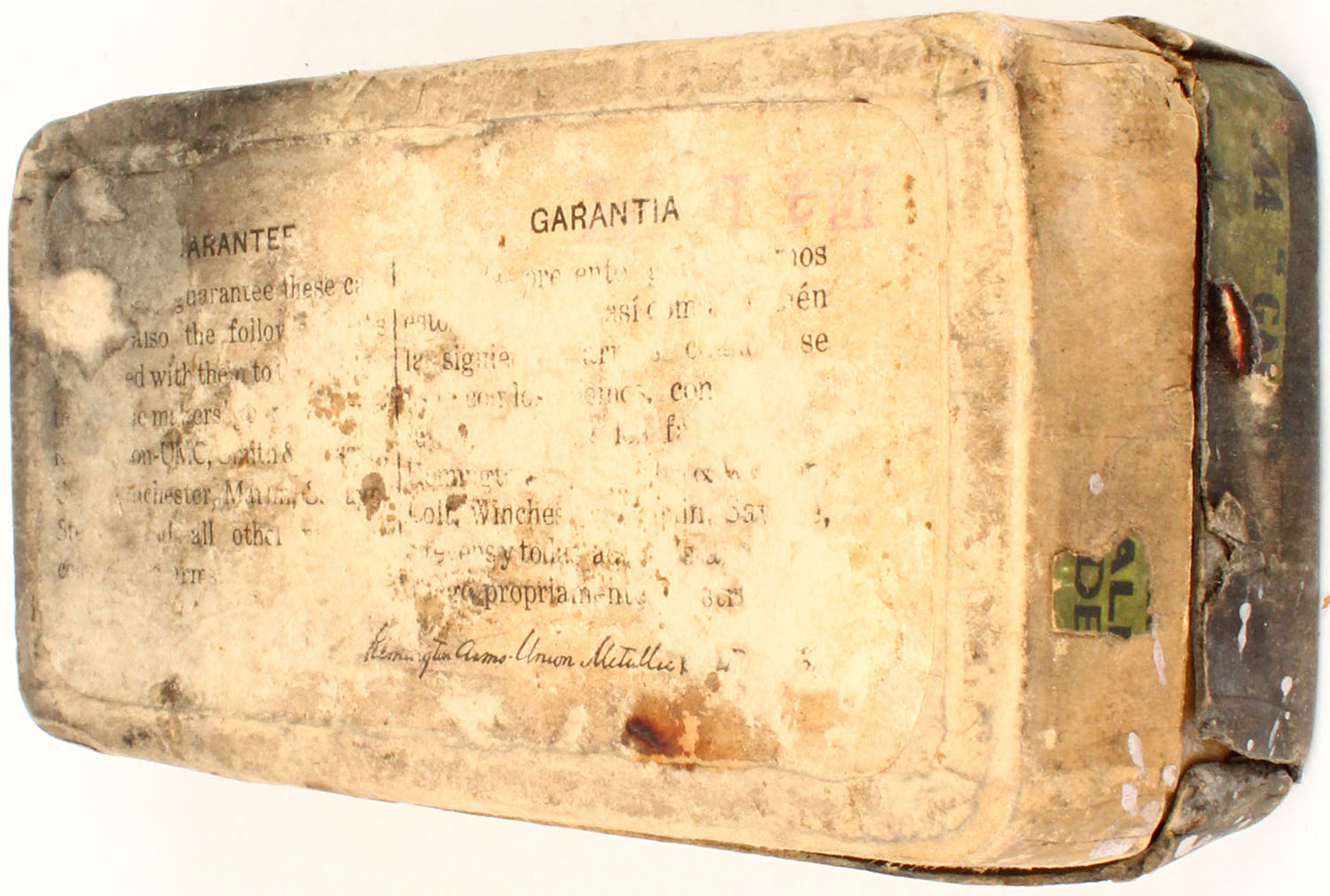 REM-UMC, .44 Marble Game Getter, black powder, round ball bullet, 2pc, Full with a couple rds. Have different color primers, buff box with green label & black/red print, box is solid with heavy black staining, age soiling, rub marks, one split corner seam on lid, parts of side labels missing, & edge wear, ammo is very good to good. Grade: Very Good - Value: 100 to 400