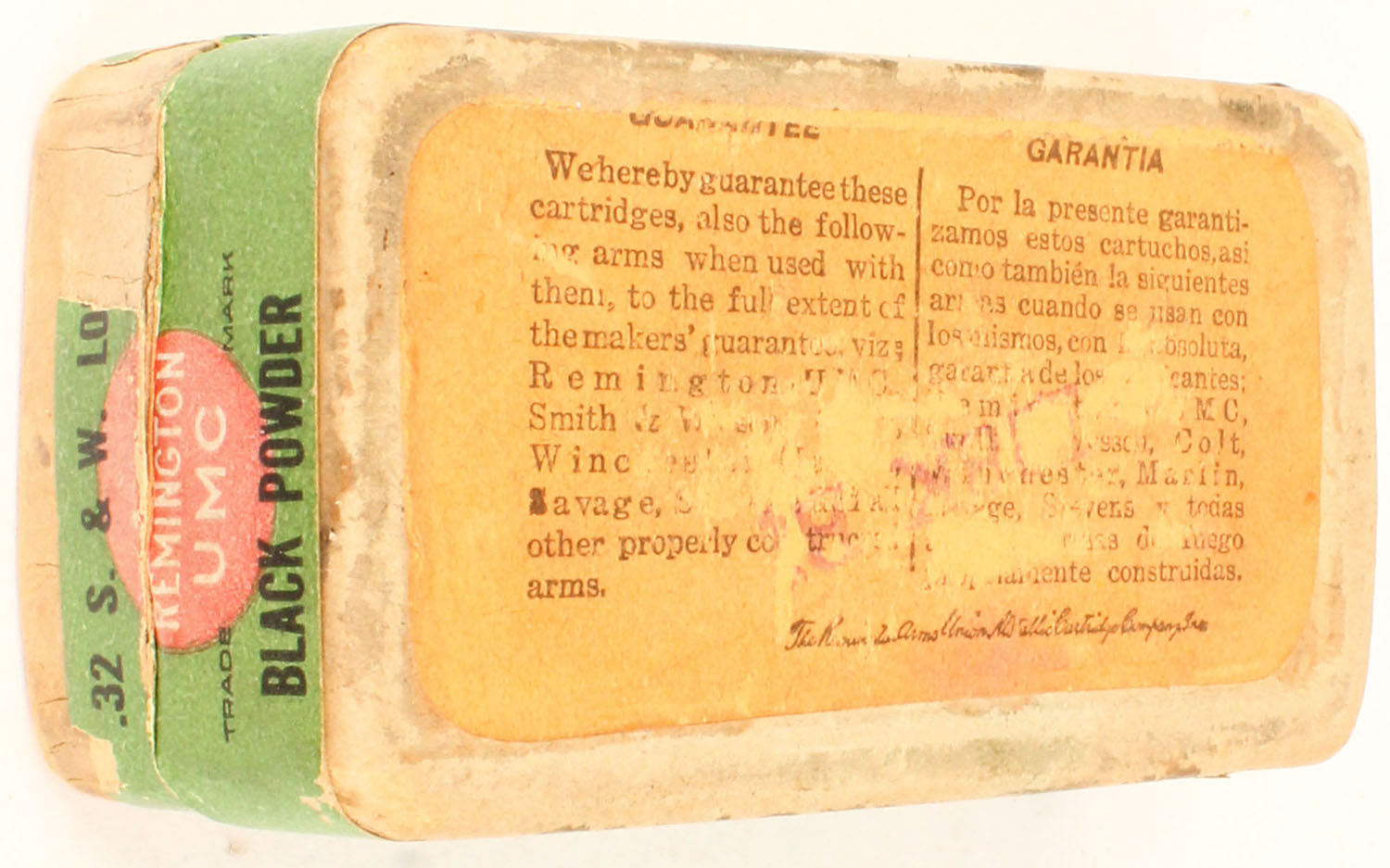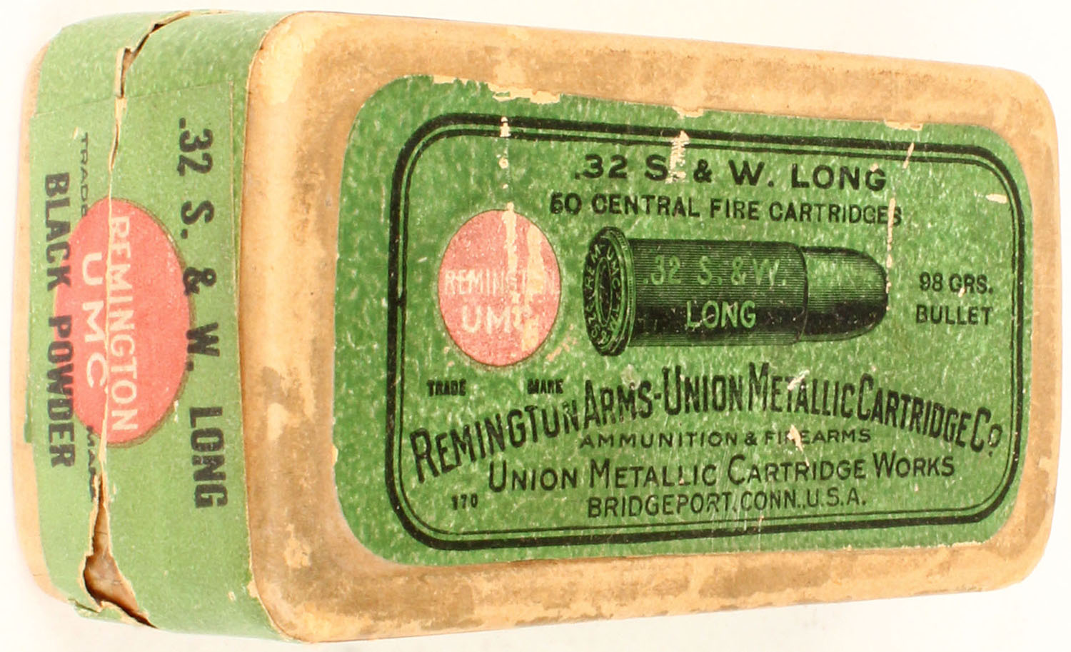 REM-UMC, .32 S&W Long, black powder, 98 Gr. bullet, 2pc, Full, buff box with green label & black/red print, box is solid with rub marks, & edge wear, ammo is very good to good. Grade: Very Good ++ - Value: 30 to 90