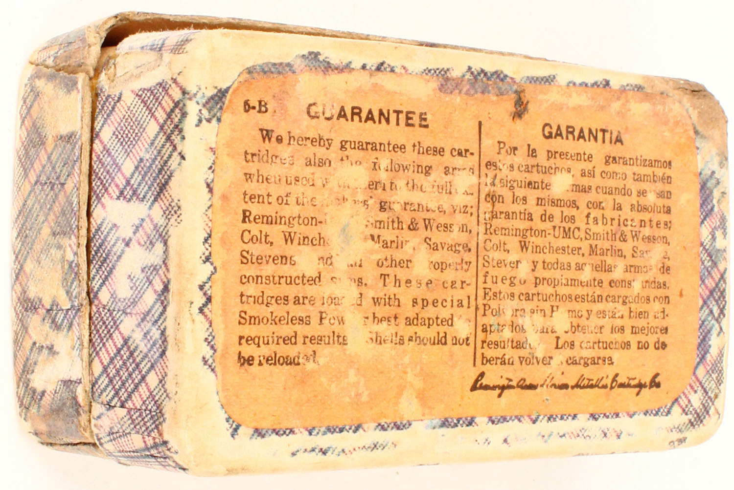 REM-UMC, .38 Long Colt, Smokeless, 2pc, Full, fabric box with buff label & black print, box has two split corner seams on lid, tape, rub marks, & edge wear, ammo is very good. Grade: Very Good + - Value: 30 to 90