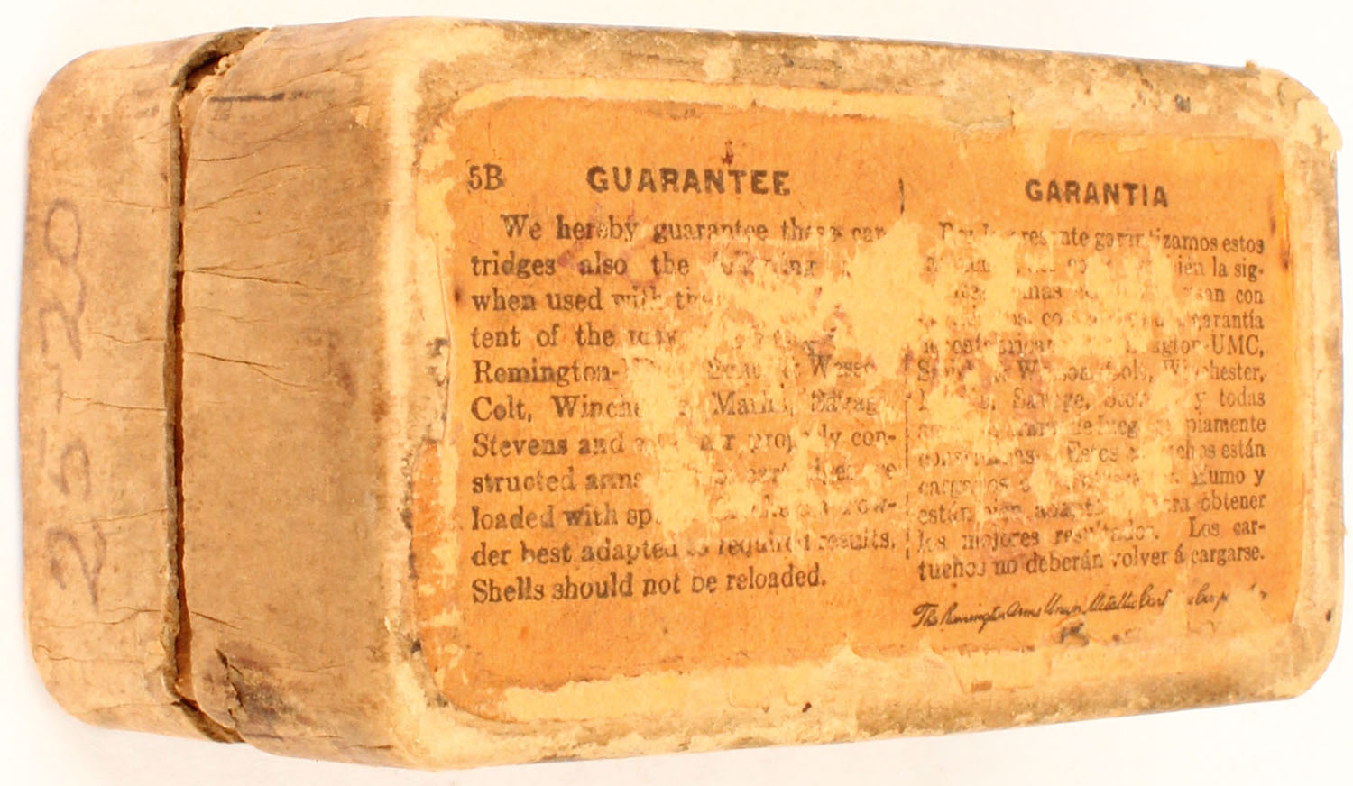 REM-UMC, .25-20 Winchester & Marlin, smokeless, soft point bullet, 2pc, Full, buff box & label with black/red print, box is solid with light age soiling, light rub marks, & light edge wear, ammo is excellent. Grade: very good ++ - Value: 30 to 90