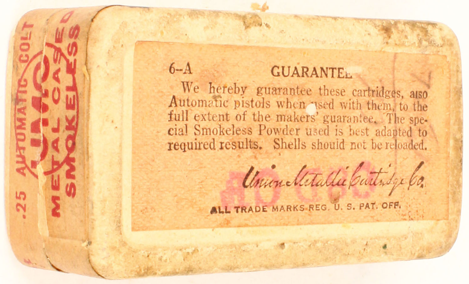 UMC, .25 automatic colt pistol, smokeless, 50 Grs. bullet 2pc, Full, buff box & label with red print, box is solid with minor age soiling, rub marks, & light edge wear, ammo is excellent. Grade: Very Good ++ - Value: 20 to 40