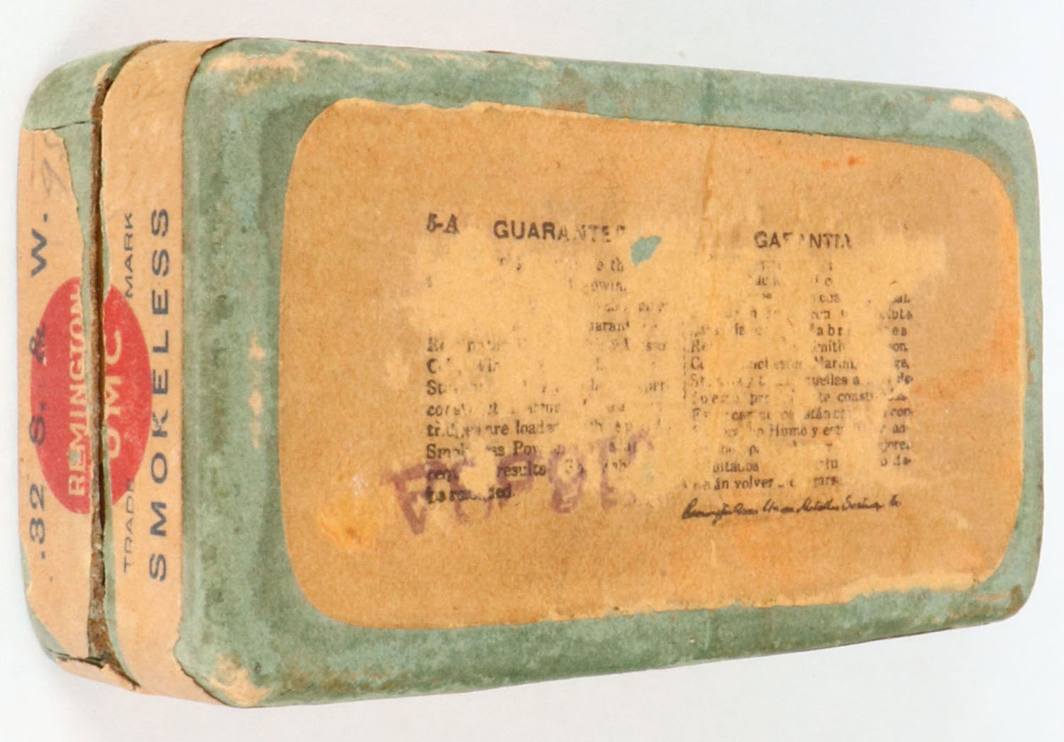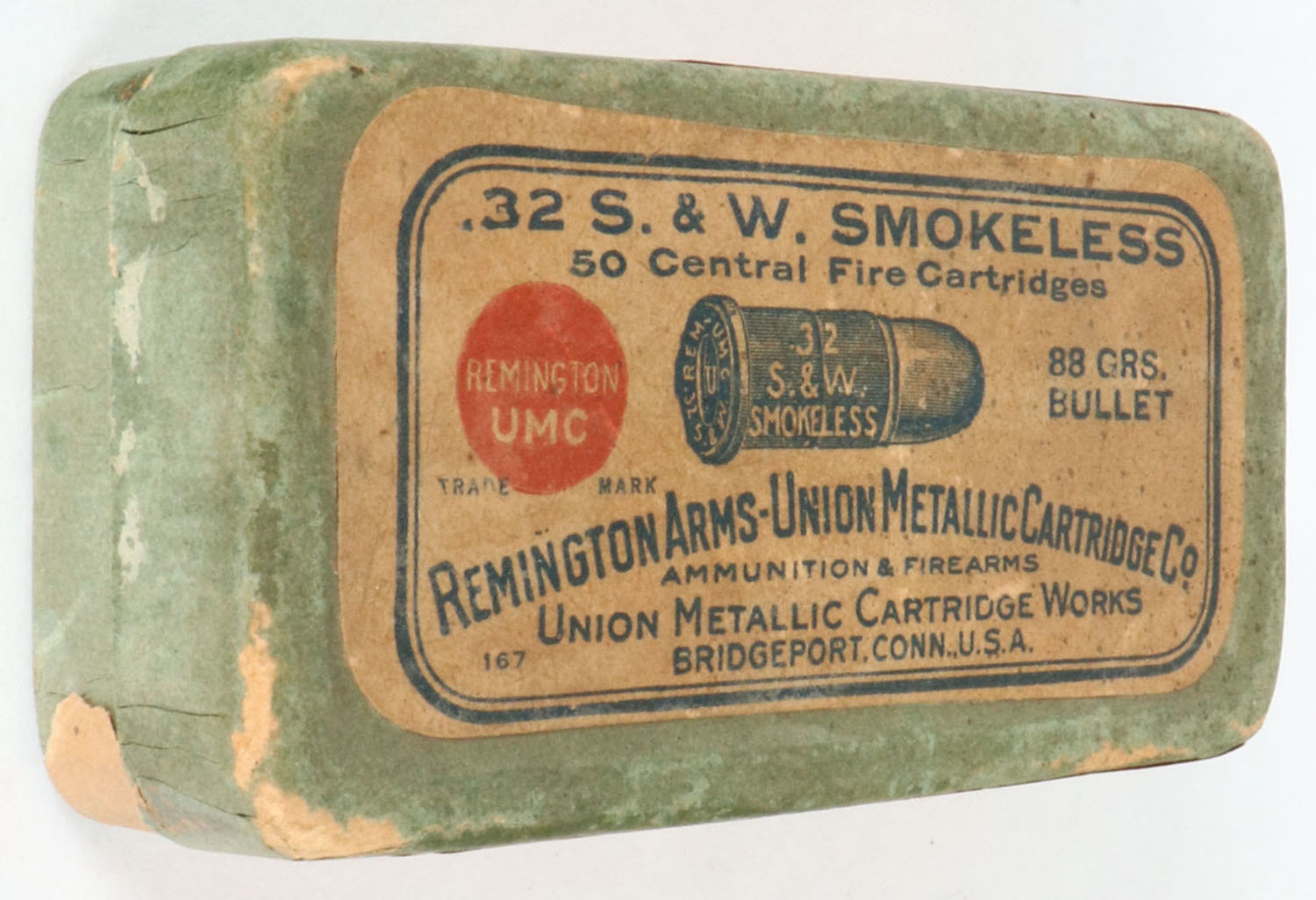 REM-UMC, .32 S&W, smokeless, 88 Gr. bullet, 2pc, Partial 41 Rds., blue box with buff label & black/red print, box is solid with parts of side labels missing, minor age soiling, minor rub marks, & light edge wear, ammo is excellent. Grade: Very Good ++ - Value: 20 to 40