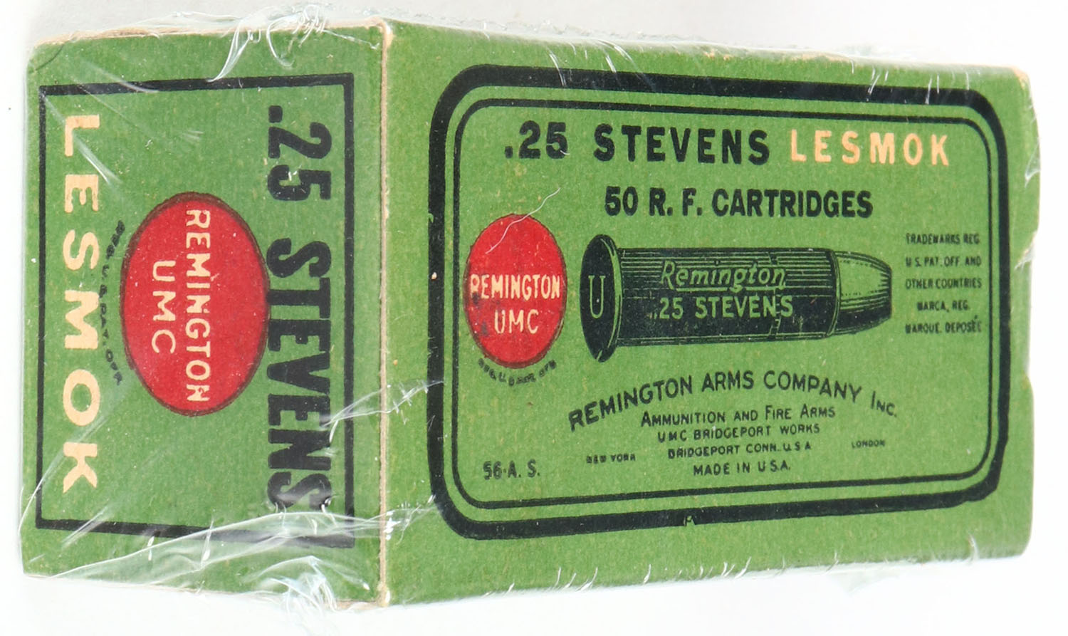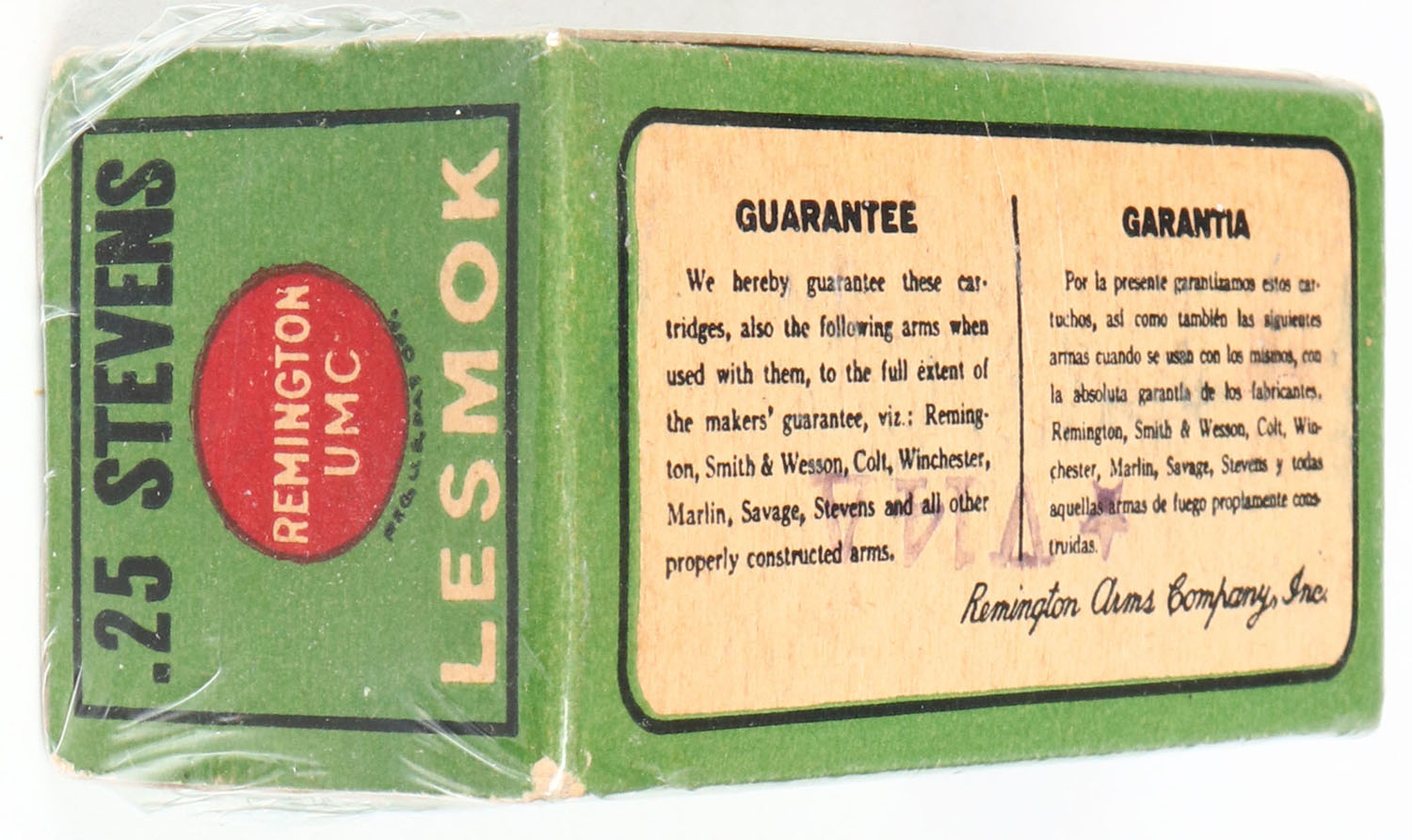 REM-UMC, .25 Stevens, Lesmok, 1pc, Full, Green box with black/red print, box is solid with little to no wear, ammo is excellent. Grade: MINT - Value: 100 to 200