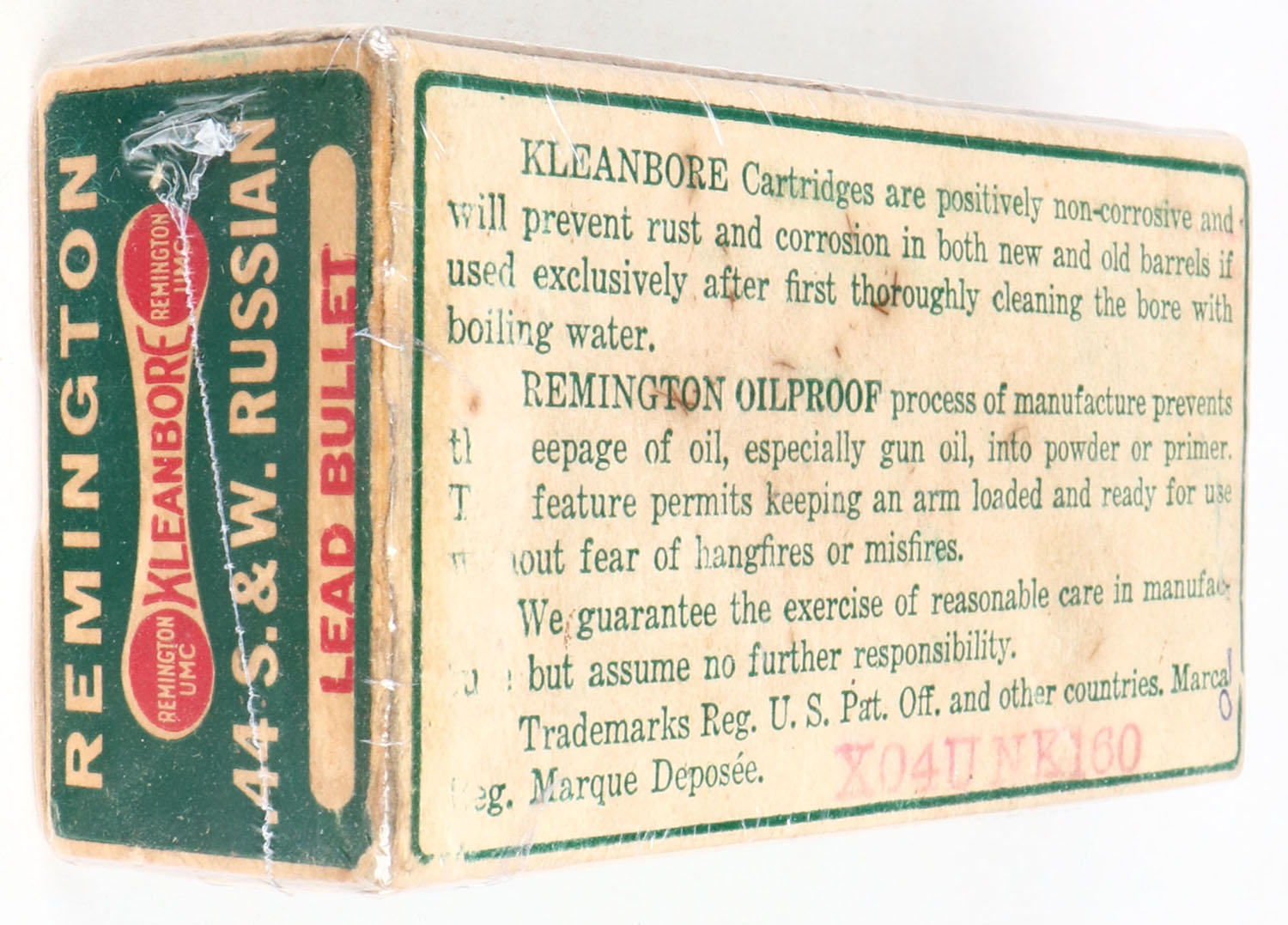 REM-UMC, Dog Bone, Kleanbore, .44 S&W Russian, 246 Gr. Lead bullet, 1pc, Full, buff box with green label & white/red print, box has one detached inside flap on left end, left end flap has a partial seam split, right end flap has a seam glue repair, light rub marks, & light edge wear, ammo is very good. Grade: Very Good ++ - Value: 60 to 120