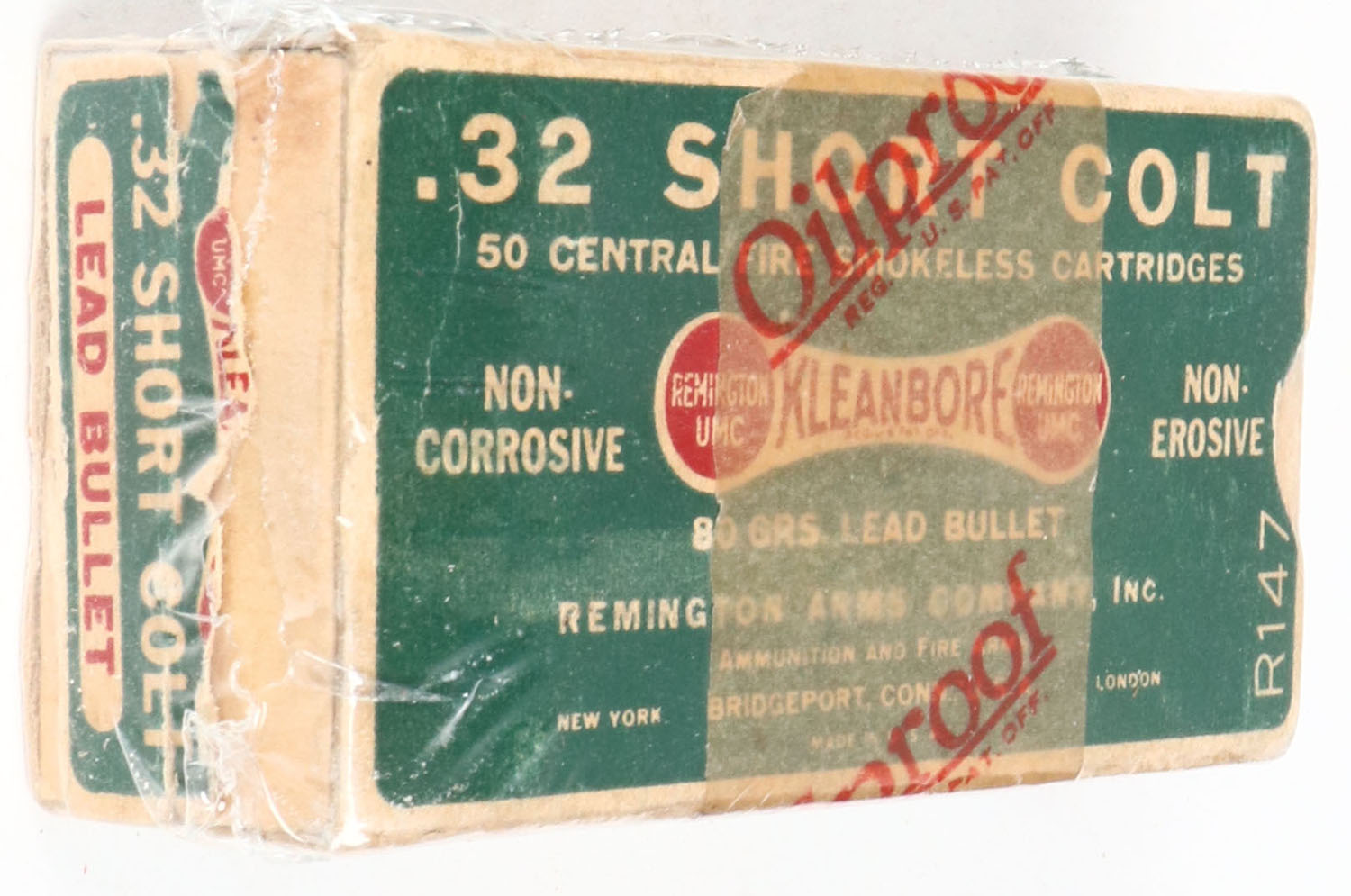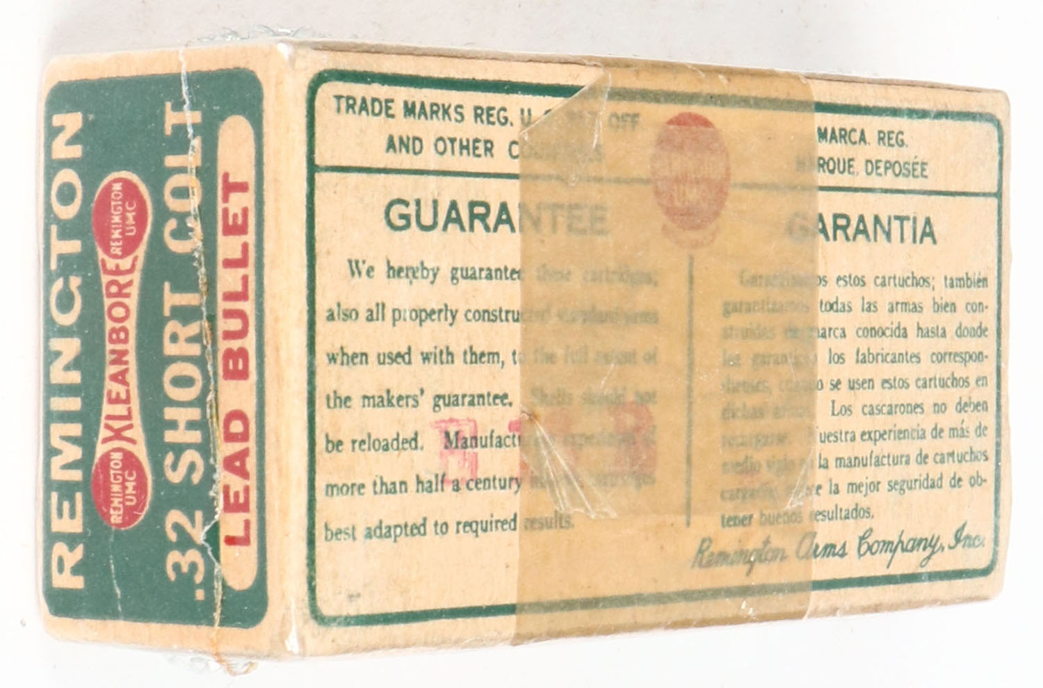 REM-UMC, Dog Bone, Kleanbore, .32 short colt, 80 Gr. Lead bullet, has Oil proof paper around box, 1pc, Partial Approx. 25 Rds., buff box with green label & white/red print, box is missing the left end flap, box has light rub marks, & light edge wear, ammo is good. Grade: Very Good + - Value: 30 to 90