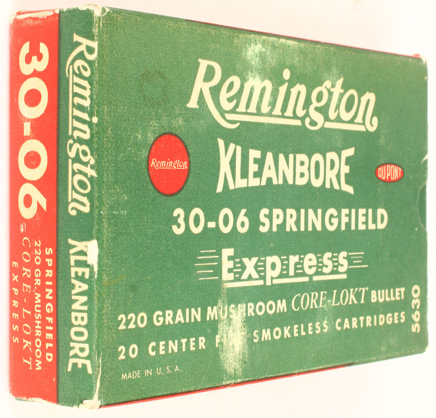 Remington, Kleanbore, .30-06 Springfield, Express, 220 Gr. mushroom core-Lokt bullet, 1pc, Full, green/red box with white print, box is solid with light rub marks, & minor edge wear, ammo is excellent. Grade: Excellent - Value: 30 to 60