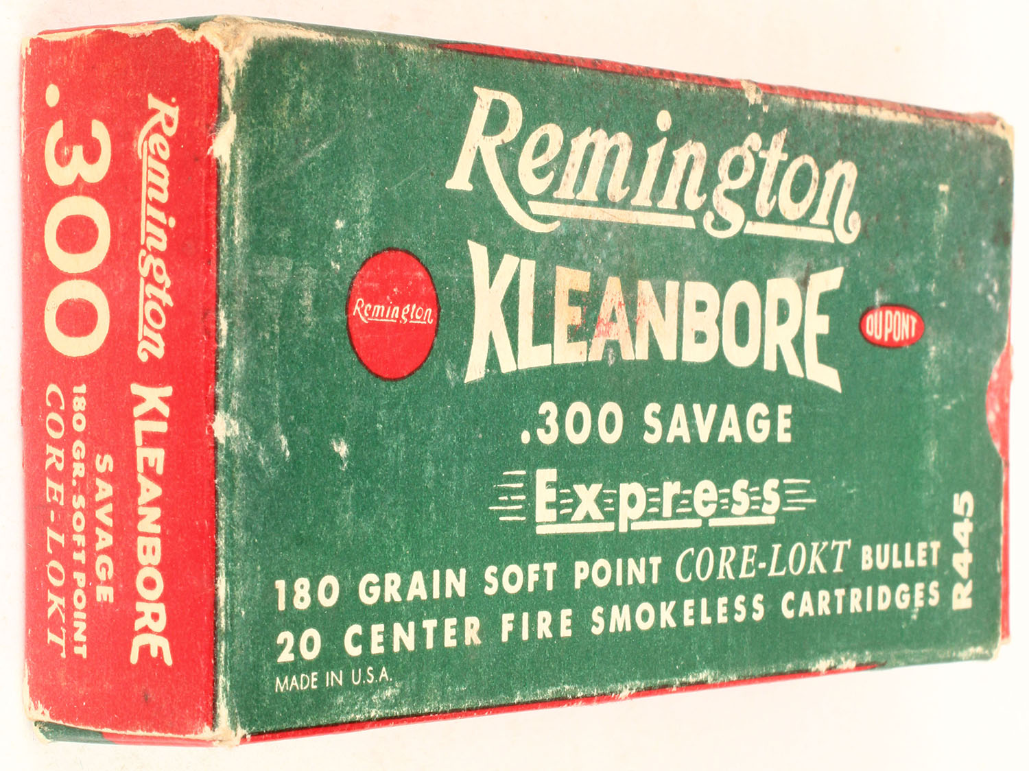 Remington, Kleanbore, .300 Savage, Express, 180 Gr. Soft point core-Lokt bullet, 1pc, Full, green/red box with white print, box is solid with factory glued seal came undone, light age soiling, handling wear, light rub marks, & minor edge wear, ammo is excellent. Grade: Very Good ++ - Value: 30 to 90