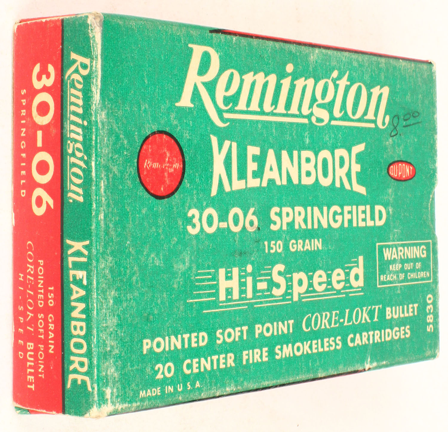 Remington, Kleanbore, .30-06 Springfield, Hi-Speed, 150 Gr. Soft point Core-Lokt bullet, 1pc, Full with 19 correct Rds., one Super-X Rd., green/red box with white print, box is solid with pen marks, rub marks, & light edge wear, ammo is excellent. Grade: Excellent + - Value: 30 to 60