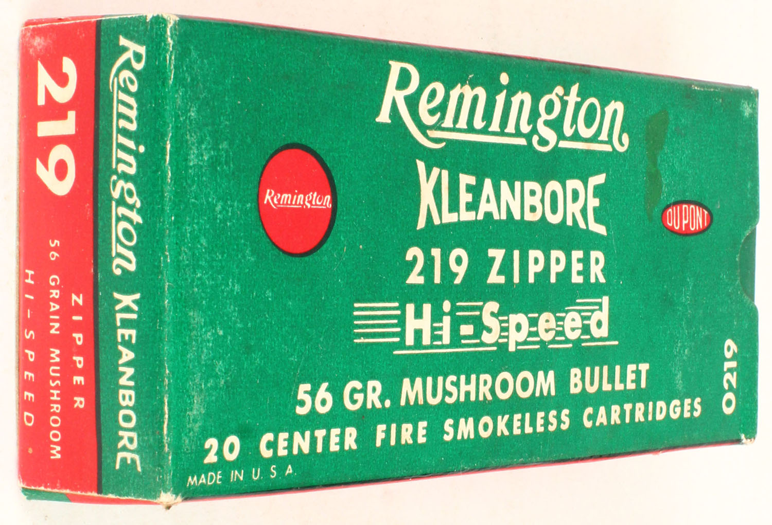Remington, Kleanbore, .219 Zipper, Hi-Speed, 56 Gr. Mushroom bullet, 1pc, Full, green/red box with white print, box is solid with minor stains, minor rub marks, & minor edge wear, ammo is excellent. Grade: Excellent + - Value: 100 to 300