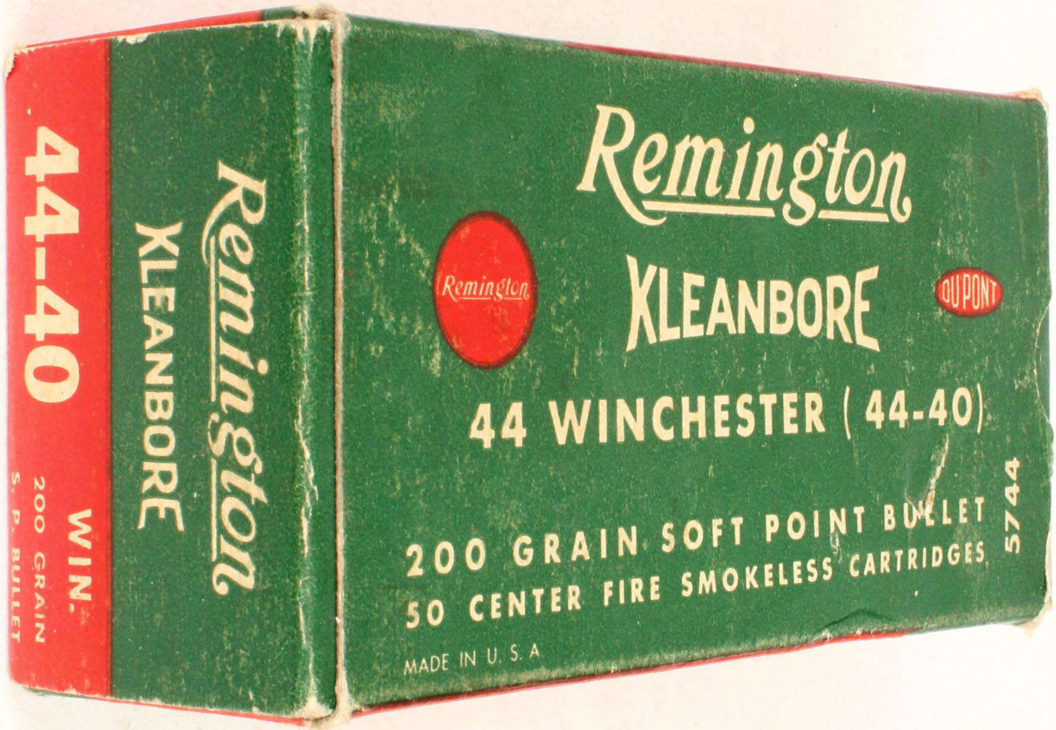 Remington, Kleanbore, .44 Winchester (44-40), 200 Gr. Soft point bullet, 1pc, Full with a few Rds. Of WRA marked H/S, green/red box with white print, box is solid with light rub marks, & light edge wear, ammo is excellent. Grade: Excellent - Value: 40 to 120