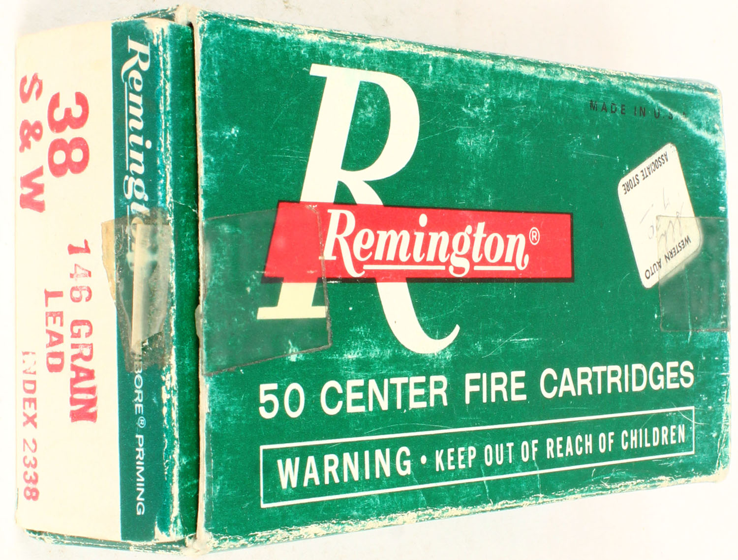 Remington, .38 S&W, 146 Gr. lead Bullet, 1pc, Full, green/white box with red/white print, box is solid with tape, stickers, rub marks, & edge wear, ammo is excellent. Grade: Very Good + - Value: 30 to 60