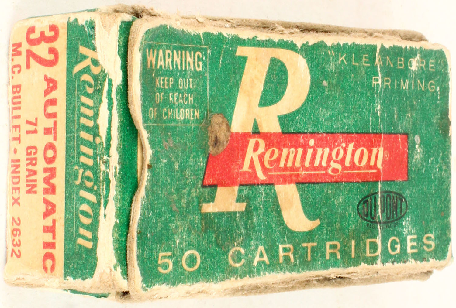 Remington, .32 Automatic, 71 Gr. MC Bullet, 1pc, Full, green/white box with red/white print, box is weak with multiple seam splits, rub marks, edge wear, & light age soiling, ammo is very good. Grade: Good ++ - Value: 30 to 60