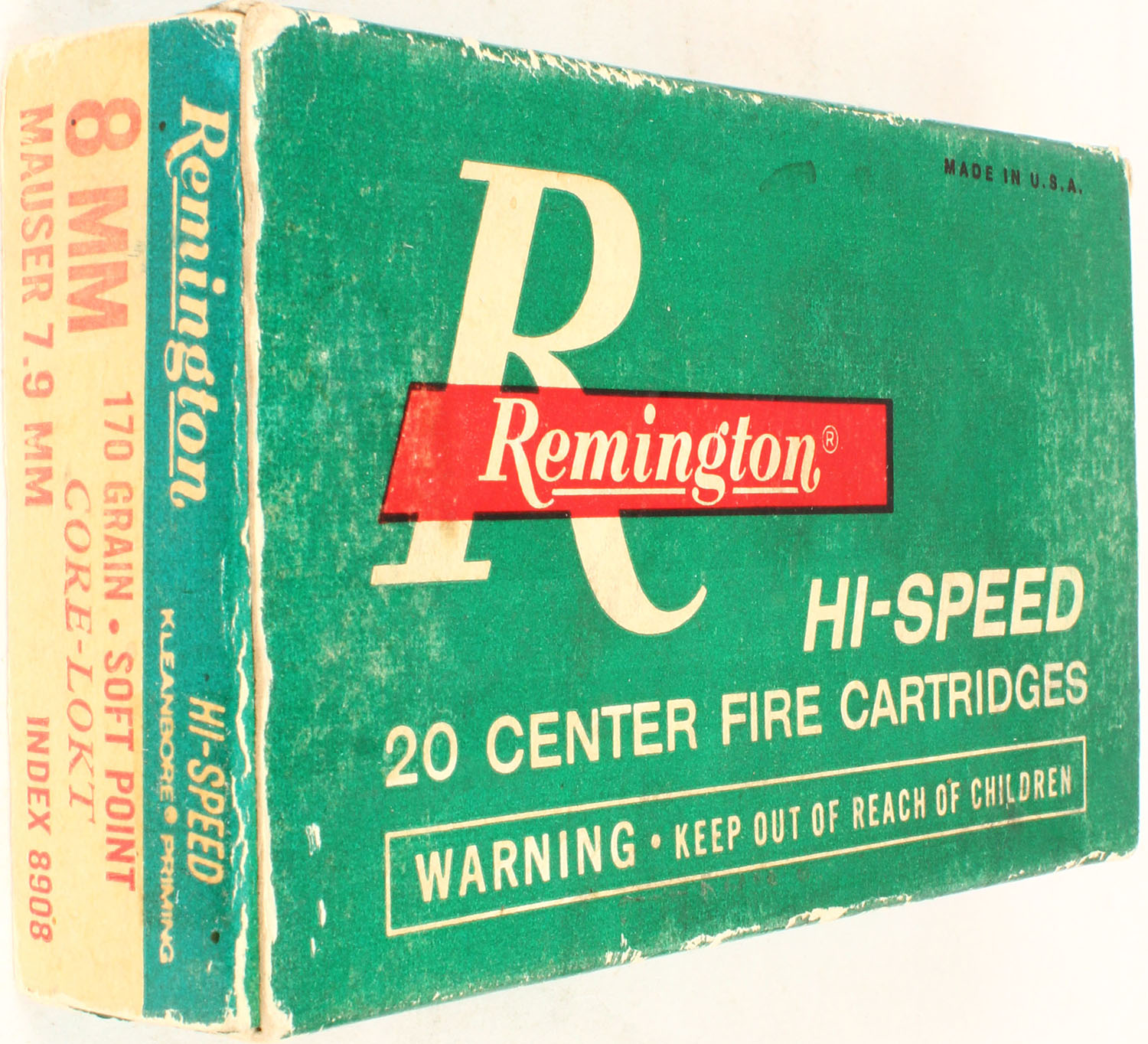 Remington, 8mm Mauser, 170 Gr. Soft point core-Lokt Bullet, 1pc, Full, green/white box with red/white print, box is solid with light rub marks, & light edge wear, ammo is excellent. Grade: Excellent - Value: 20 to 40