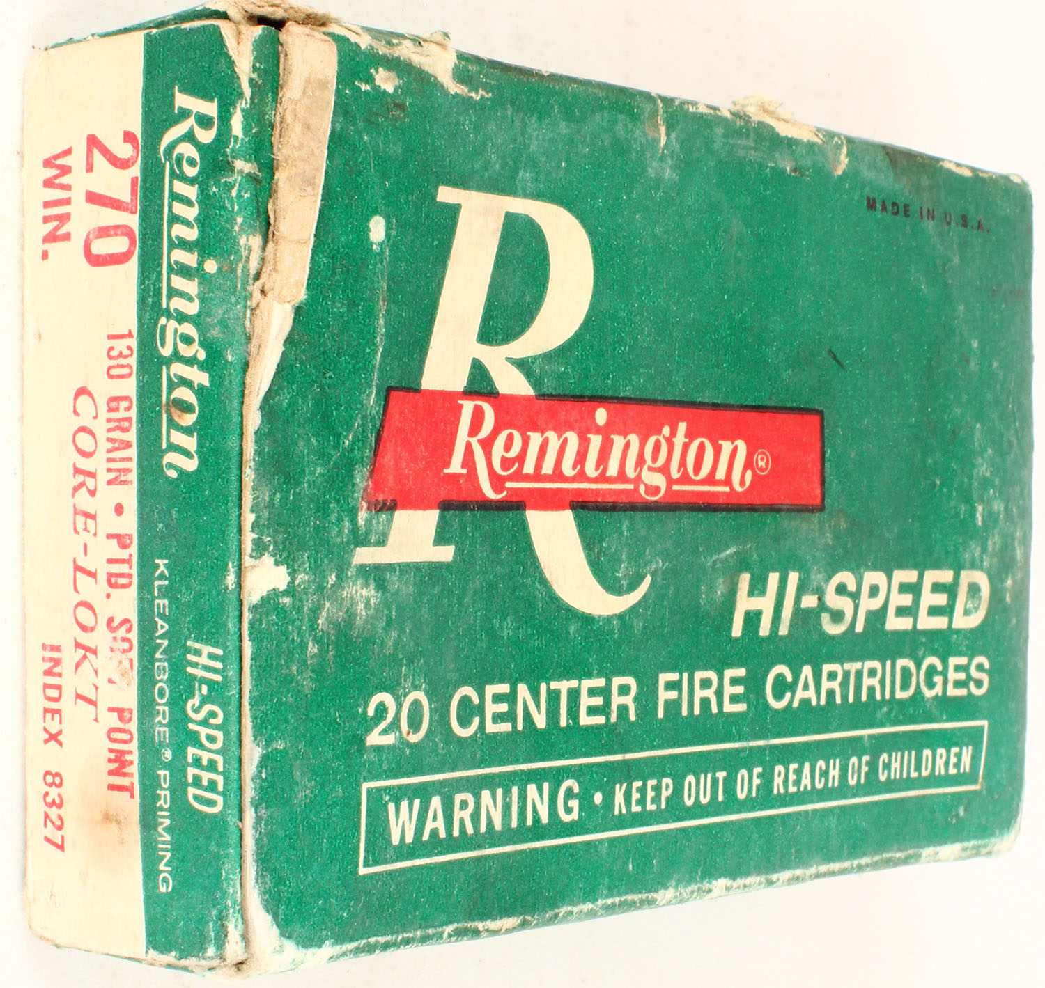 Remington, .270 Win., 130 Gr. PTD Soft point core-Lokt Bullet, 1pc, Full, green/white box with red/white print, box is solid with handling wear, stains, rub marks, & edge wear, ammo is very good. Grade: Very Good + - Value: 30 to 60