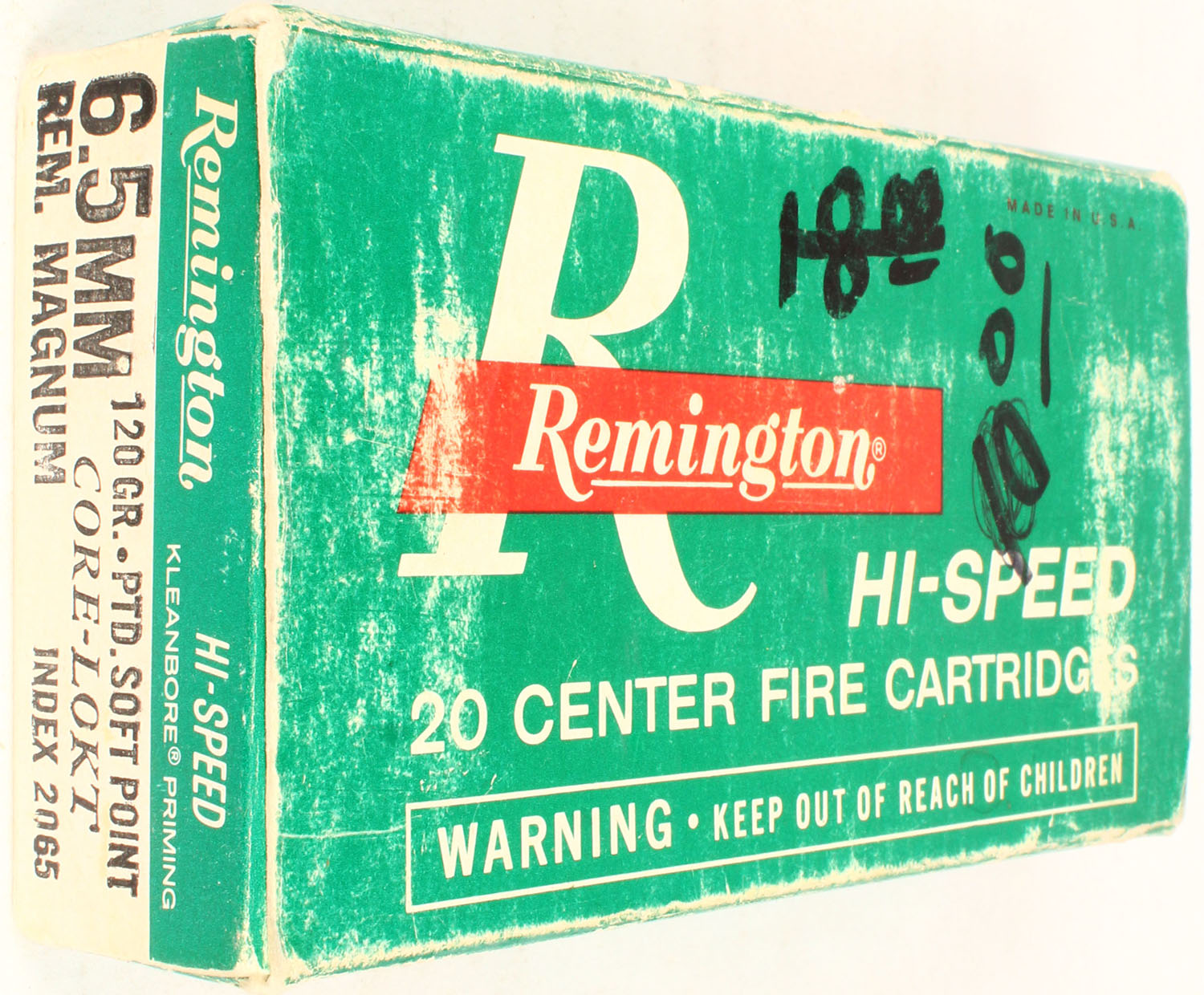 Remington, 6.5mm Rem. Magnum, 120 Gr. PTD Soft point core-Lokt Bullet, 1pc, Full, green/white box with red/white print, box is solid with pen marks, rub marks, & edge wear, ammo is excellent. Grade: Excellent - Value: 30 to 90