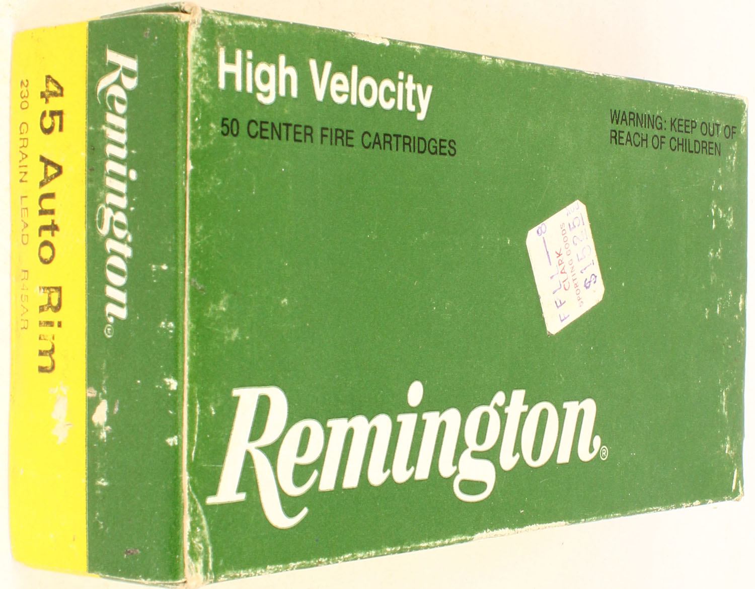 Remington, High Velocity, .45 Auto Rim, 230 Gr. Lead bullet, 1pc, Full, green/yellow box with white/black print, box is solid with sticker on face, light rub marks & light edge wear, ammo is very good. Grade: Excellent - Value: 60 to 120