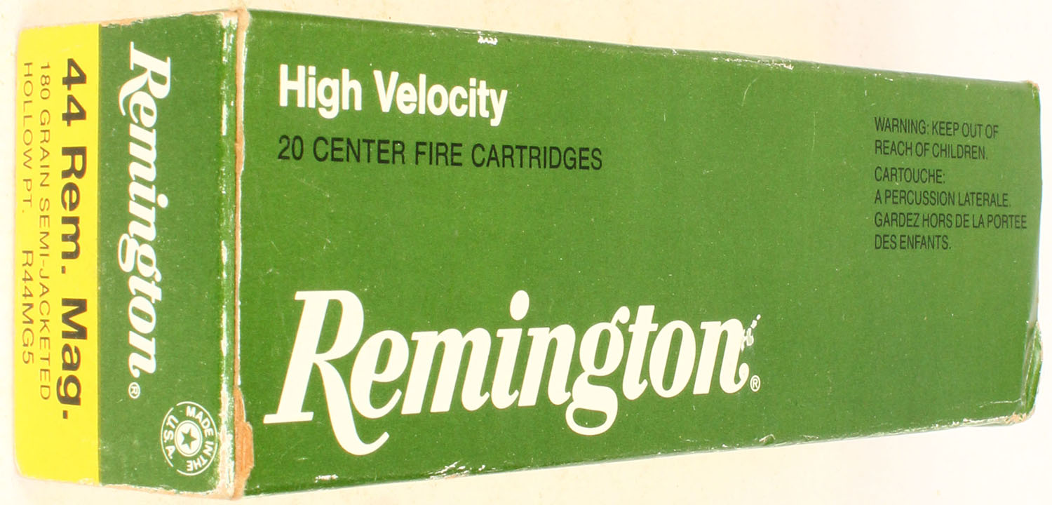 Remington, High Velocity, .44 Rem. Mag., 180 Gr. Semi-jacketed hollow PT bullet, 1pc, Full, green/yellow box with white/black print, box is solid with, minor rub marks & minor edge wear, ammo is Excellent. Grade: Excellent ++ - Value: 30 to 60