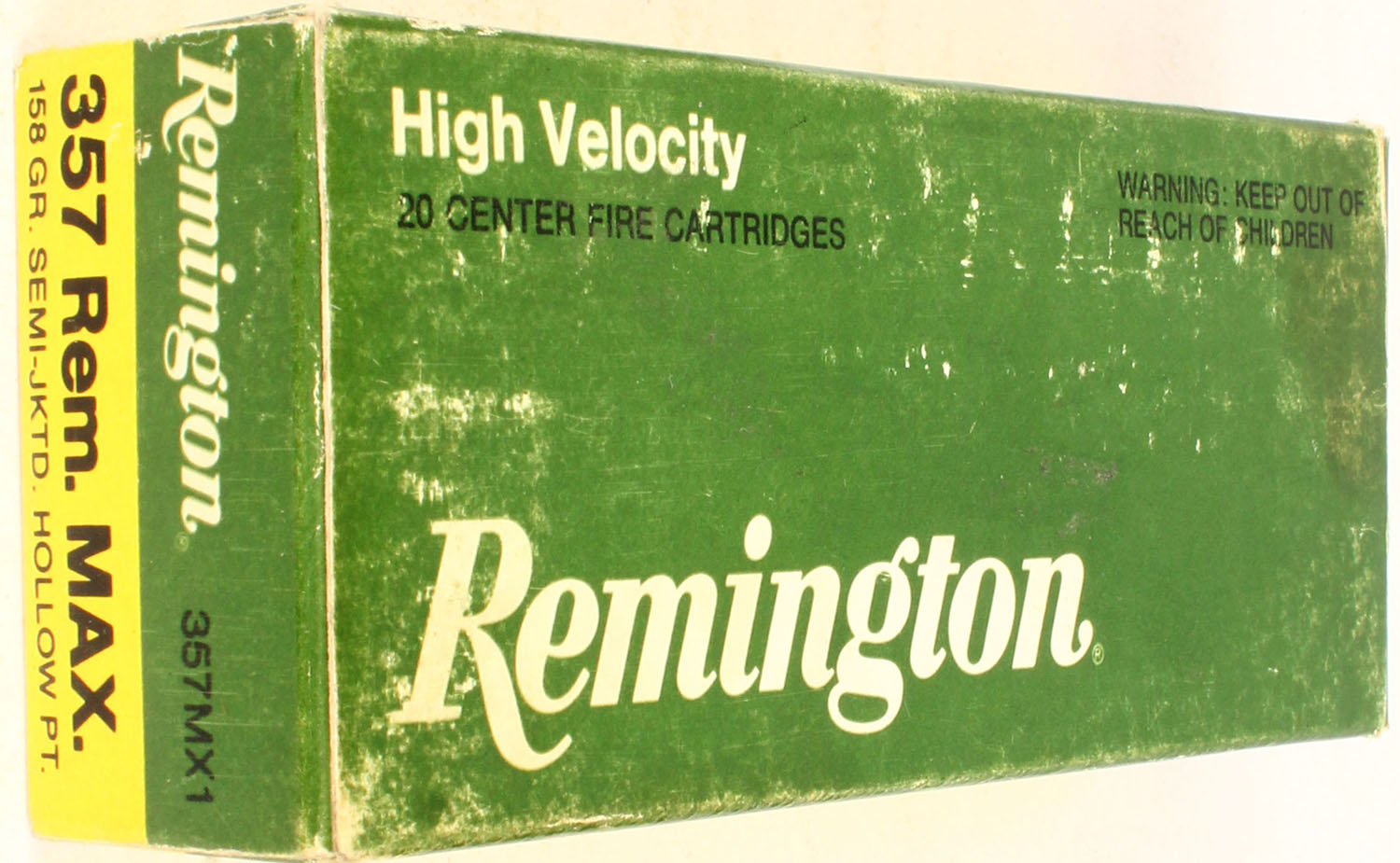 Remington, High Velocity, .357 Rem. MAX., 153 Gr. Semi-jacketed hollow PT bullet, 1pc, Full, green/yellow box with white/black print, box is solid with, rub marks & minor edge wear, ammo is Excellent. Grade: Excellent - Value: 30 to 60