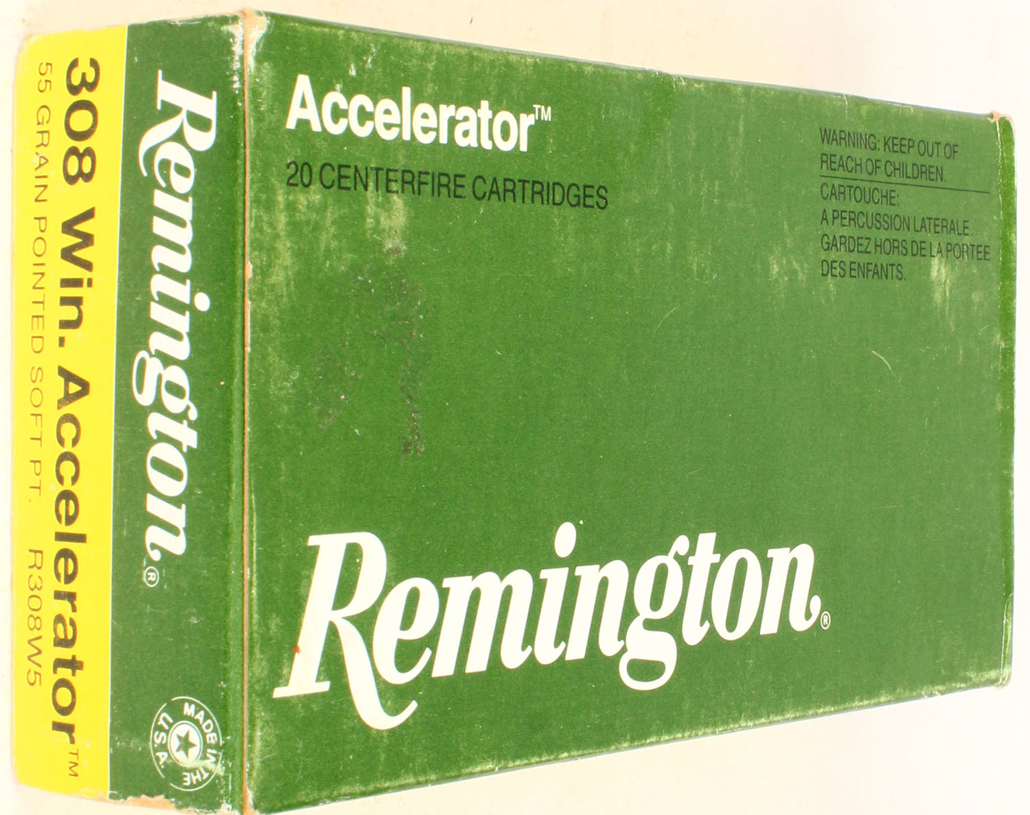 Remington, Accelerator, .308 Win. Accelerator, 55 Grain Pointed Soft Pt., Full, 1pc. Green yellow & white box, box is solid with excellent color, very minor shelf & corner wear, edges are mostly crisp, end flaps are solid, ammo is excellent. Grade: Excellent - Value: 30 to 60
