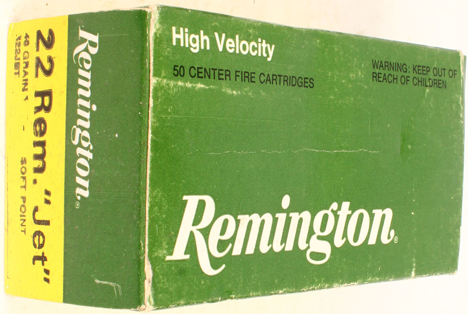 Remington, .22 Rem ''Jet'', High Velocity, 40 Gr Soft PT, 1pc, Full, green/yellow box with black/white print, box is solid with light rub marks, ammo is excellent. Grade: Excellent - Value: 20 to 60