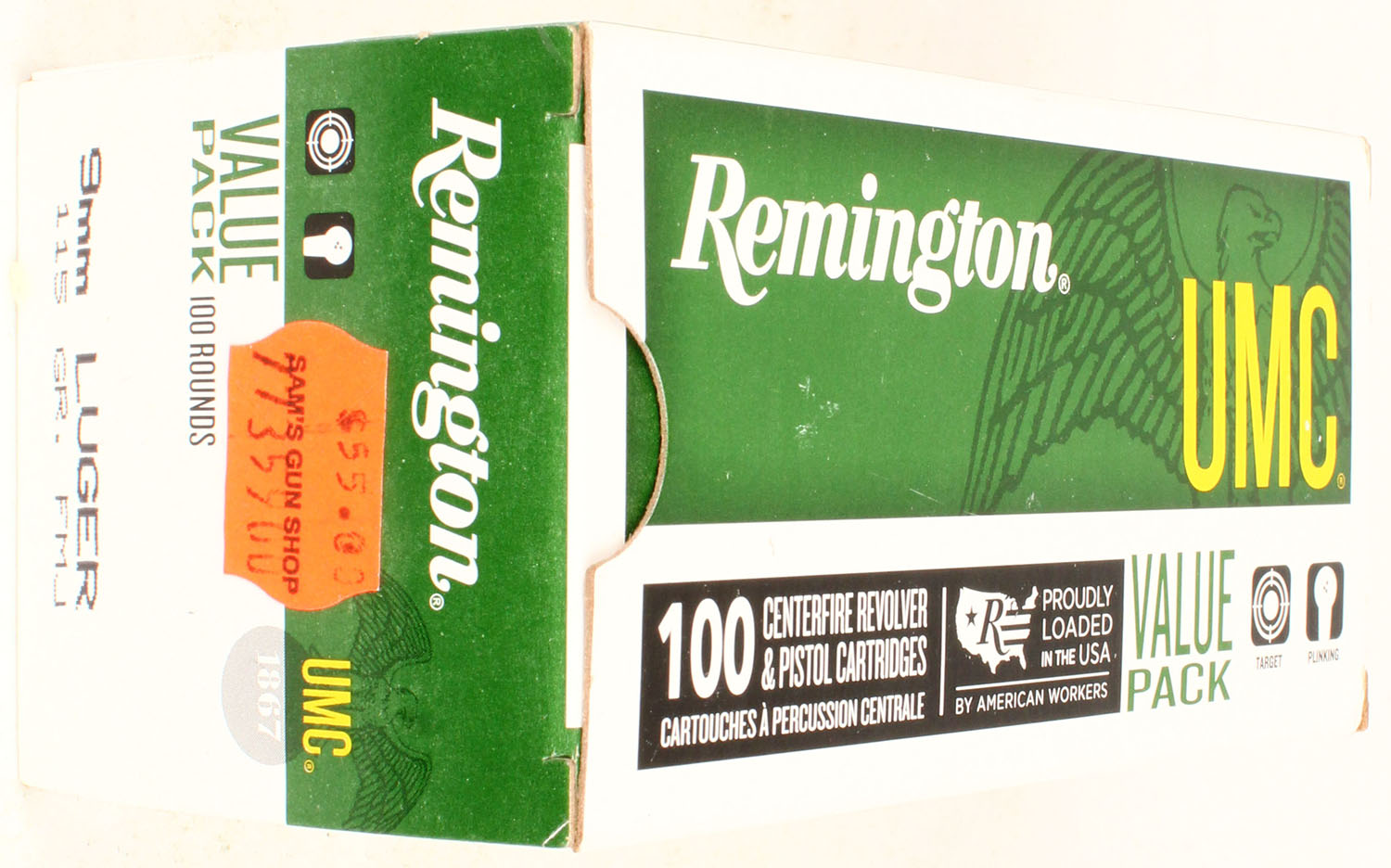 Remington, 9mm Luger, UMC, 115 Gr. FMJ, 1pc, Full, multi-colored box, box is solid, ammo is excellent. Grade: Excellent - Value: 20 to 60
