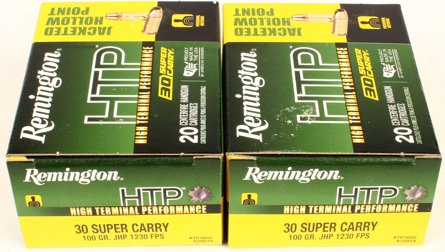 Lot of 2 Remington, 30 Super Carry, HTP, 100 Gr. JHP, 1pc, Full, multi-colored box, box is solid, ammo is excellent. Grade: Excellent - Value: 20 to 60