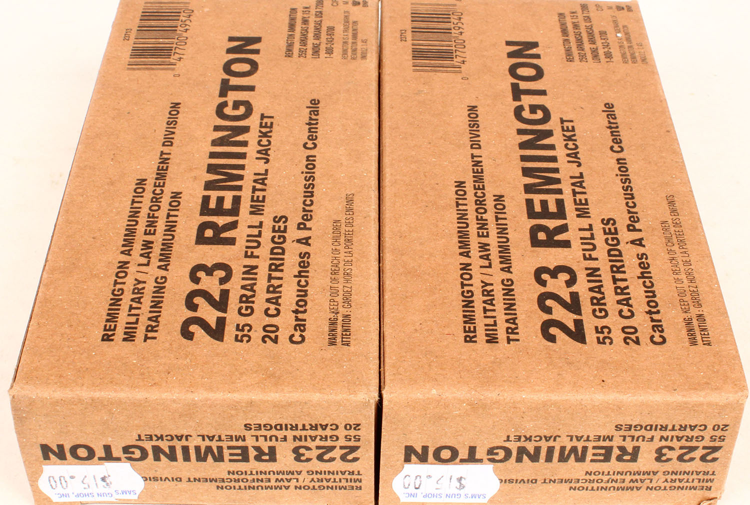 Lot of 2 Remington, Military/Law Enforcement Division, 223 Remington, 55 Gr. FMJ, 1pc, Full, multi-colored box, box is solid, ammo is excellent. Grade: Excellent - Value: 20 to 60
