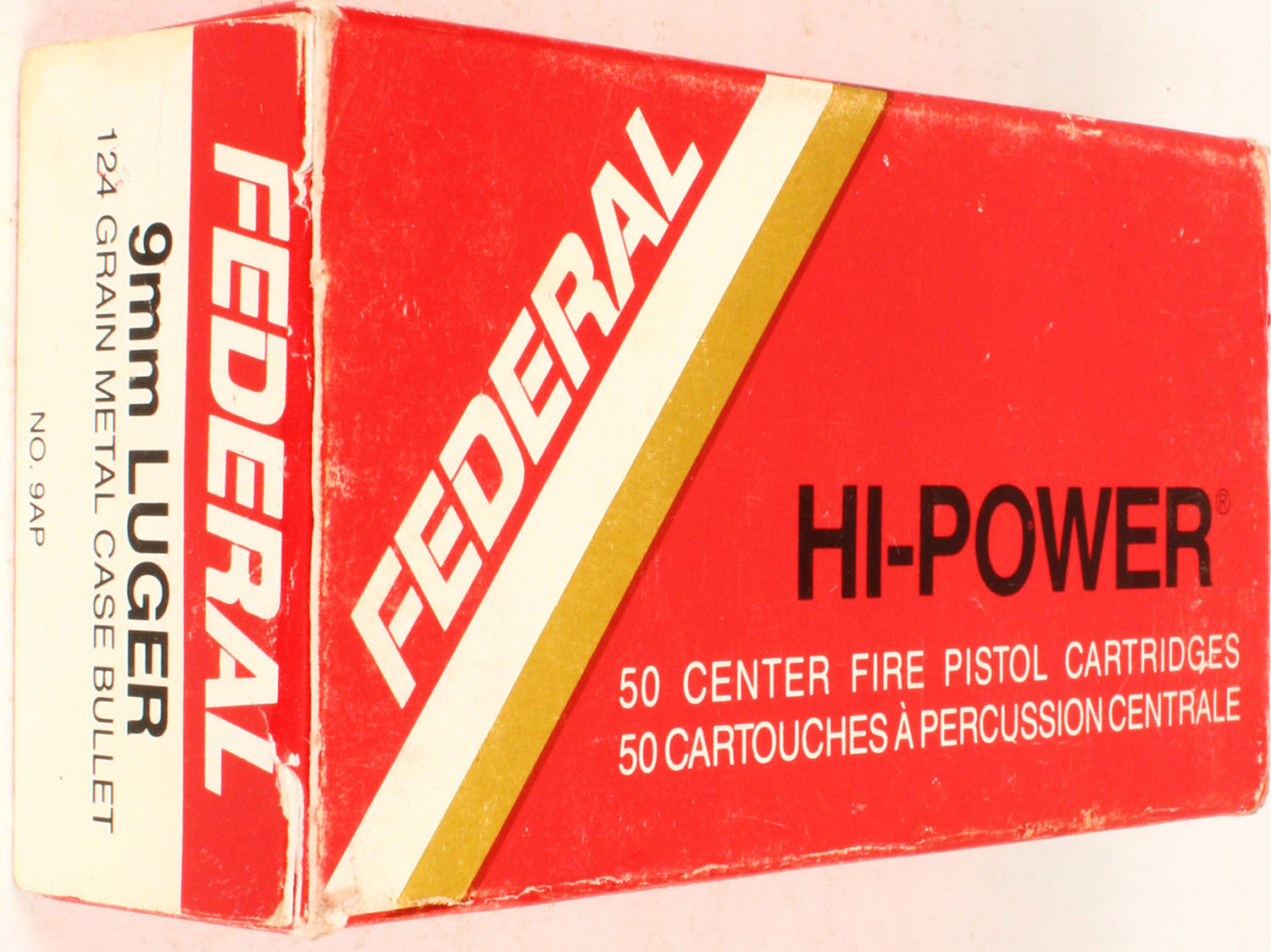 Federal, 9mm Luger, 1pc., Full, 124 Gr. Metal Case Bullet, No. 9AP, box is solid, ammo is excellent. Grade: Excellent - Value: 20 to 60