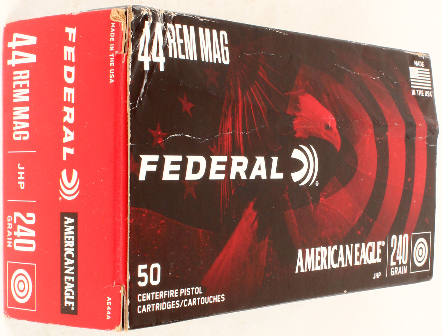 Federal, American Eagle, 44 Rem Mag JHP, 240 Grain, Full, 1pc. multi-colored box, box is solid with excellent color, Ammo is excellent. Grade: Excellent - Value: 20 to 60