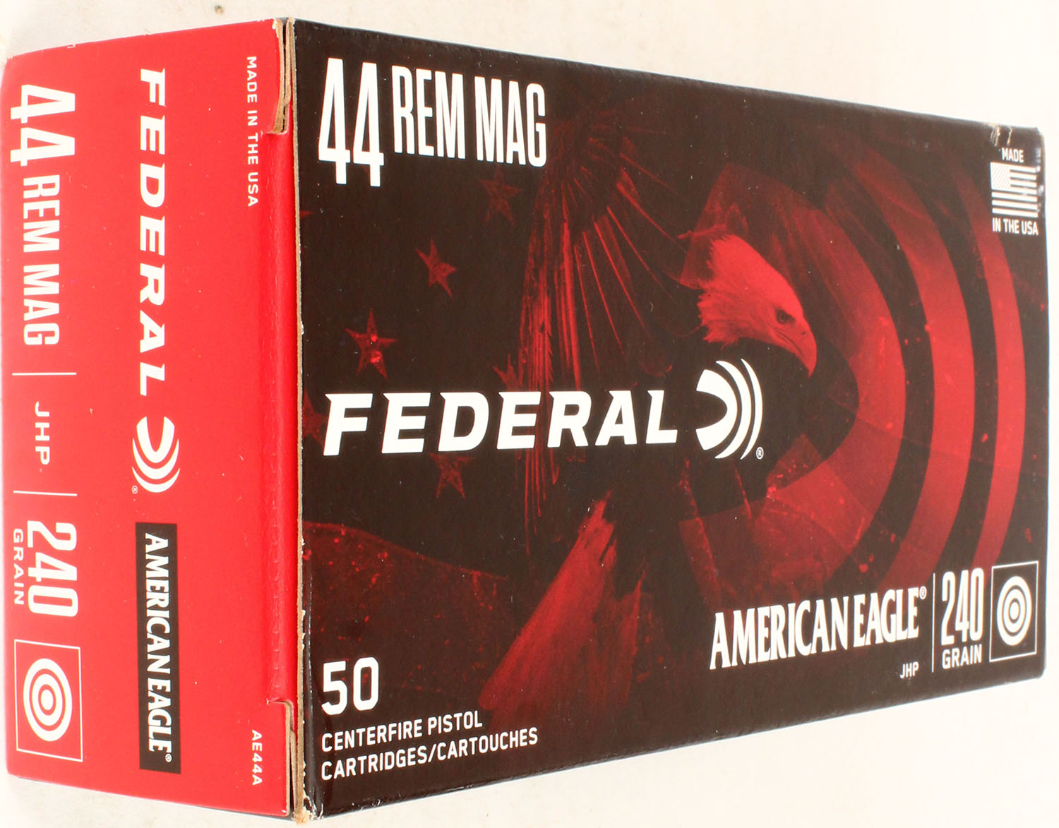 Federal, American Eagle, 44 Rem Mag JHP, 240 Grain, Full, 1pc. multi-colored box, box is solid with excellent color, Ammo is excellent. Grade: Excellent - Value: 20 to 60