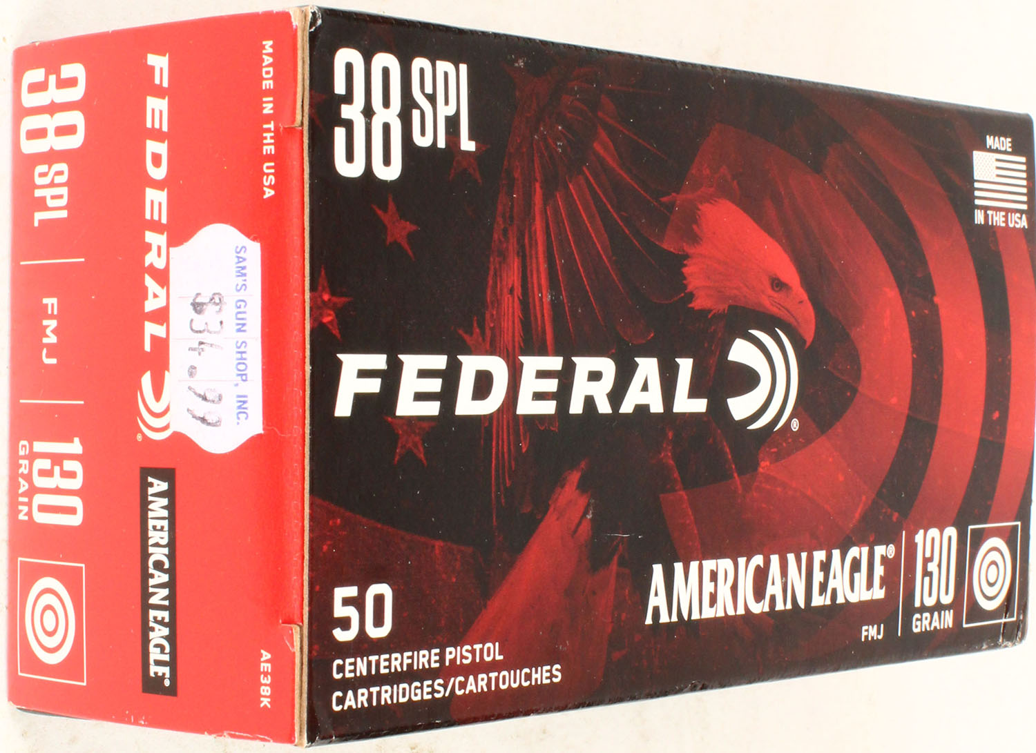Federal, American Eagle, 38 SPL FMJ, 130 Grain, Full, 1pc. multi-colored box, box is solid with excellent color, Ammo is excellent. Grade: Excellent - Value: 20 to 60