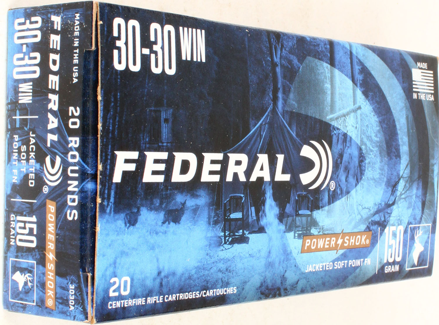 Federal, Power-Shok, 30-30 Win, 150 Grain SP FN, Full, 1pc. multi-colored box, box is solid with excellent color, Ammo is excellent. Grade: Excellent - Value: 20 to 60