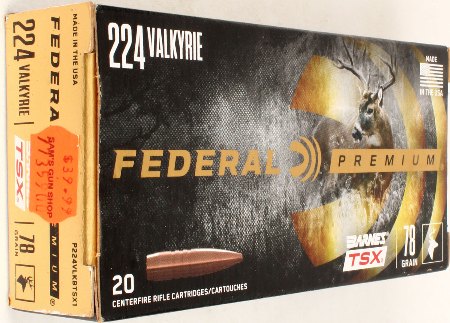 Federal, Premium, 224 Valkyrie, 78 Grain Barnes TSX, Full, 1pc. multi-colored box, box is solid with excellent color, Ammo is excellent. Grade: Excellent - Value: 20 to 60