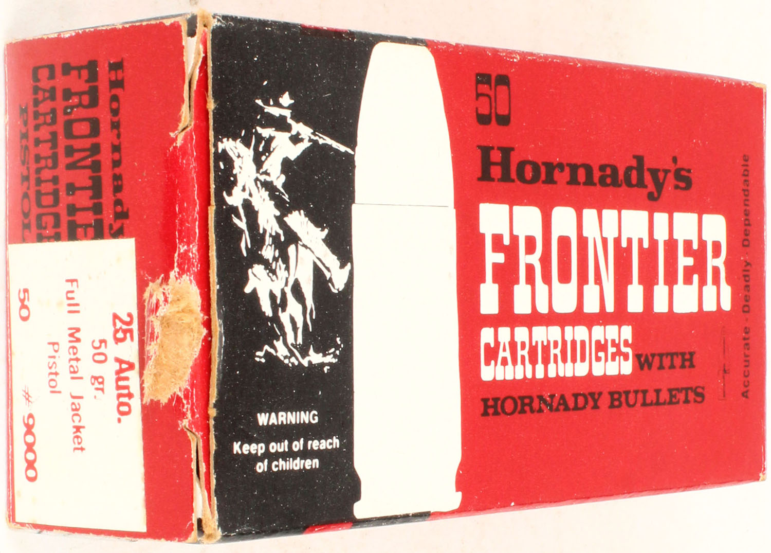 Hornady, Frontier, 25 Auto, 50 Grain FMJ, Full, 1pc. multi-colored box, box is solid with excellent color, Ammo is excellent. Grade: Excellent - Value: 20 to 60